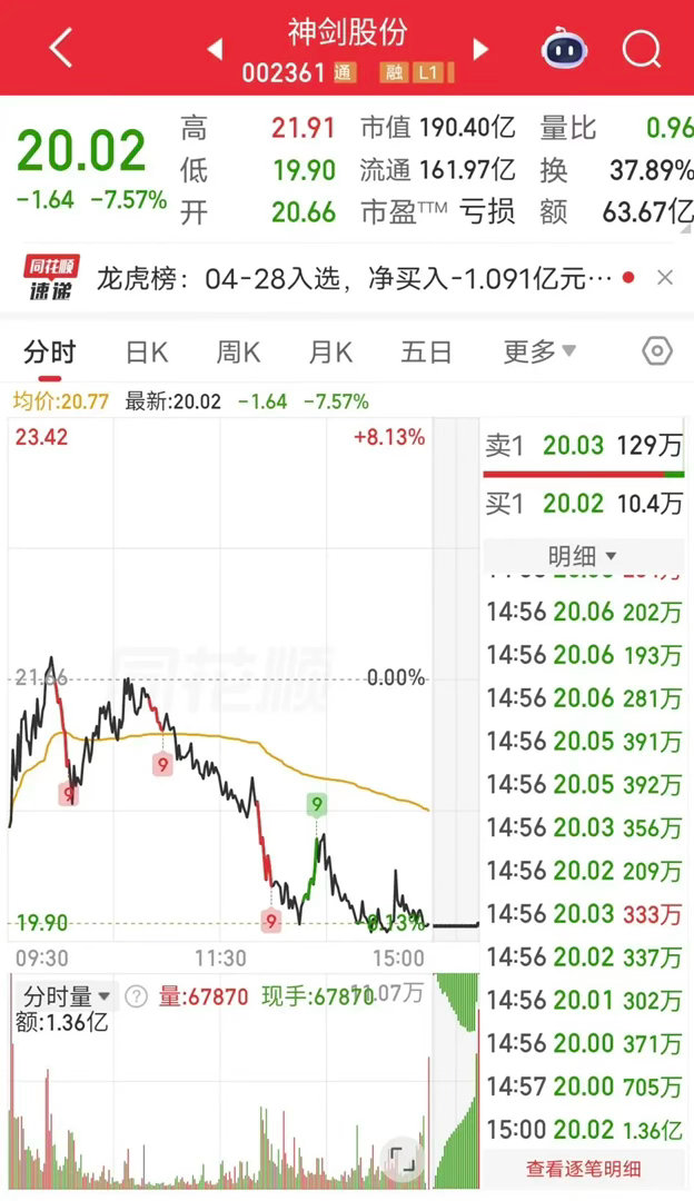 章盟主节前提款,砸盘1.4亿!今天近期热门股神剑股份大跌7%。盘后龙虎榜数据显示