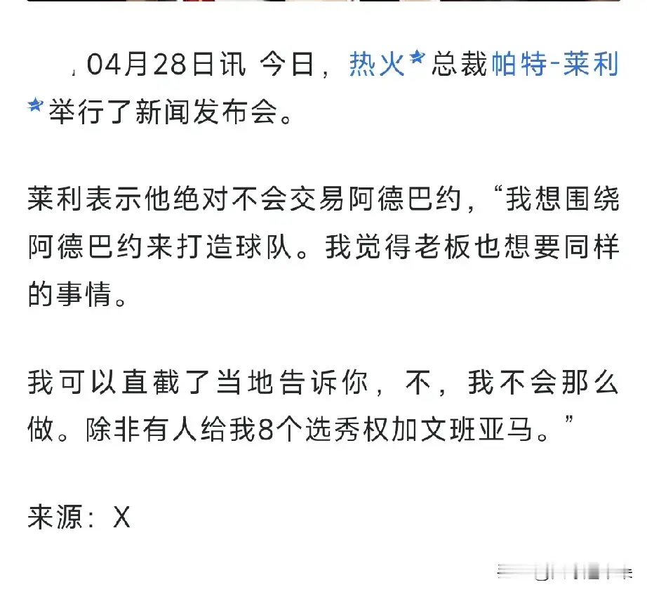 所以人还真的不能老,老了啥话都敢说啊。文班亚马+8个首轮才能换阿德巴约[捂脸],难怪当初巴特勒说莱利精神错乱,这就一点也不奇怪了。说实话阿德巴约+8个首轮人家马刺肯定也不会同意的,你倒好了竟然直接反过来!晒图笔记大赛