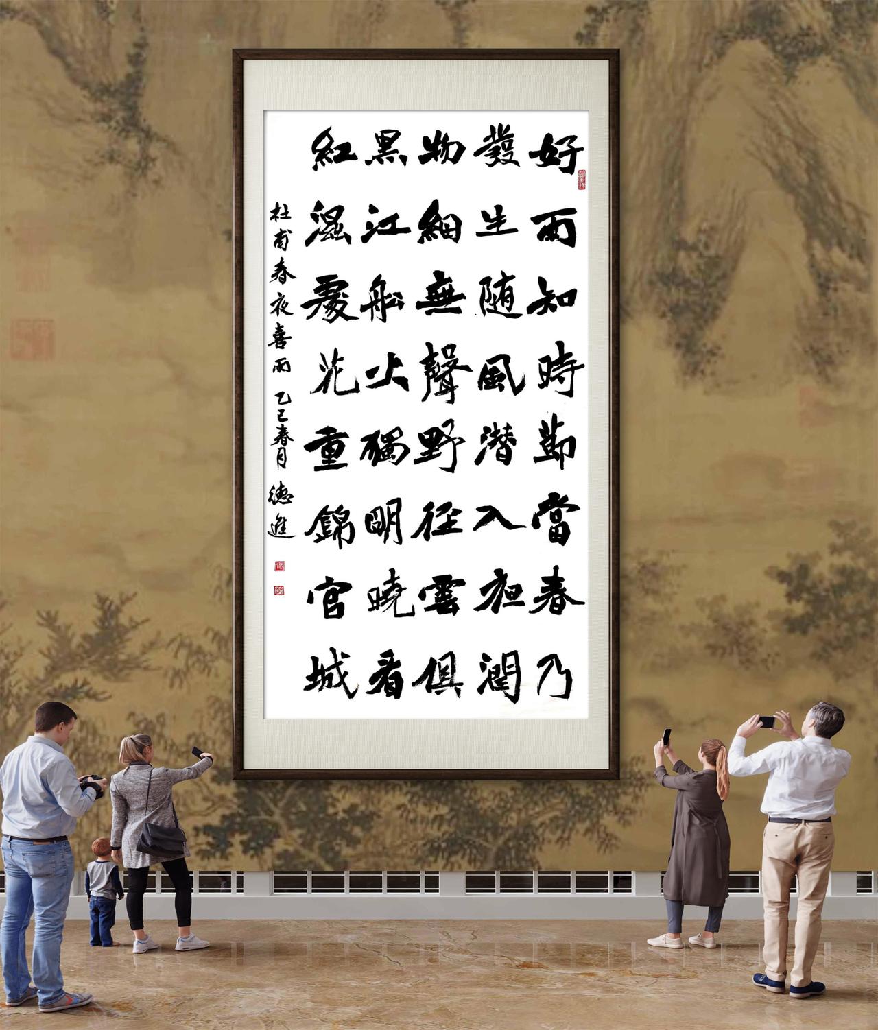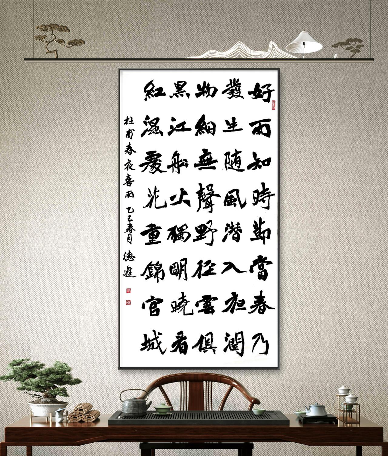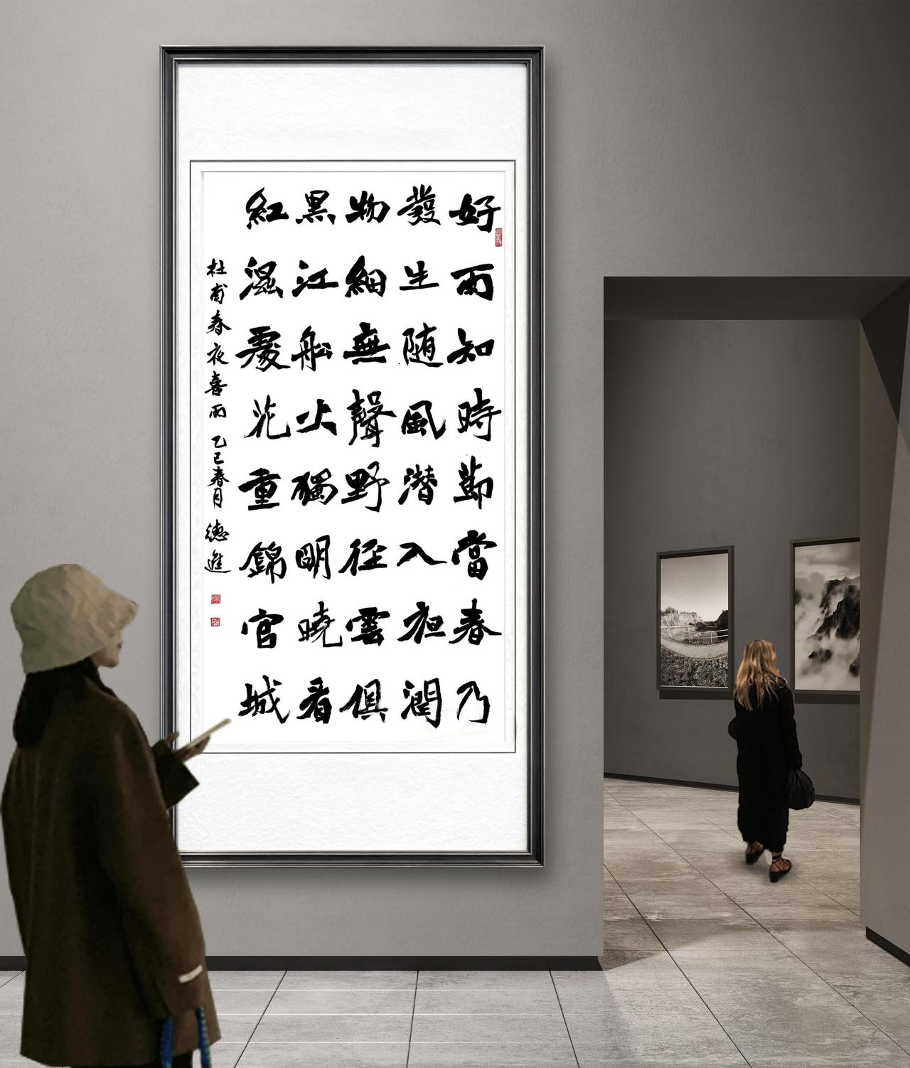 铺展素宣,以魏楷恭录杜甫《春夜喜雨》竖幅作品,让碑刻古意与唐诗雅韵在笔墨间交融。魏楷作为北魏碑刻书法的典范,既承汉隶厚重,又启唐楷规整,其创作要点堪称 “刚柔相济,法度暗藏”。