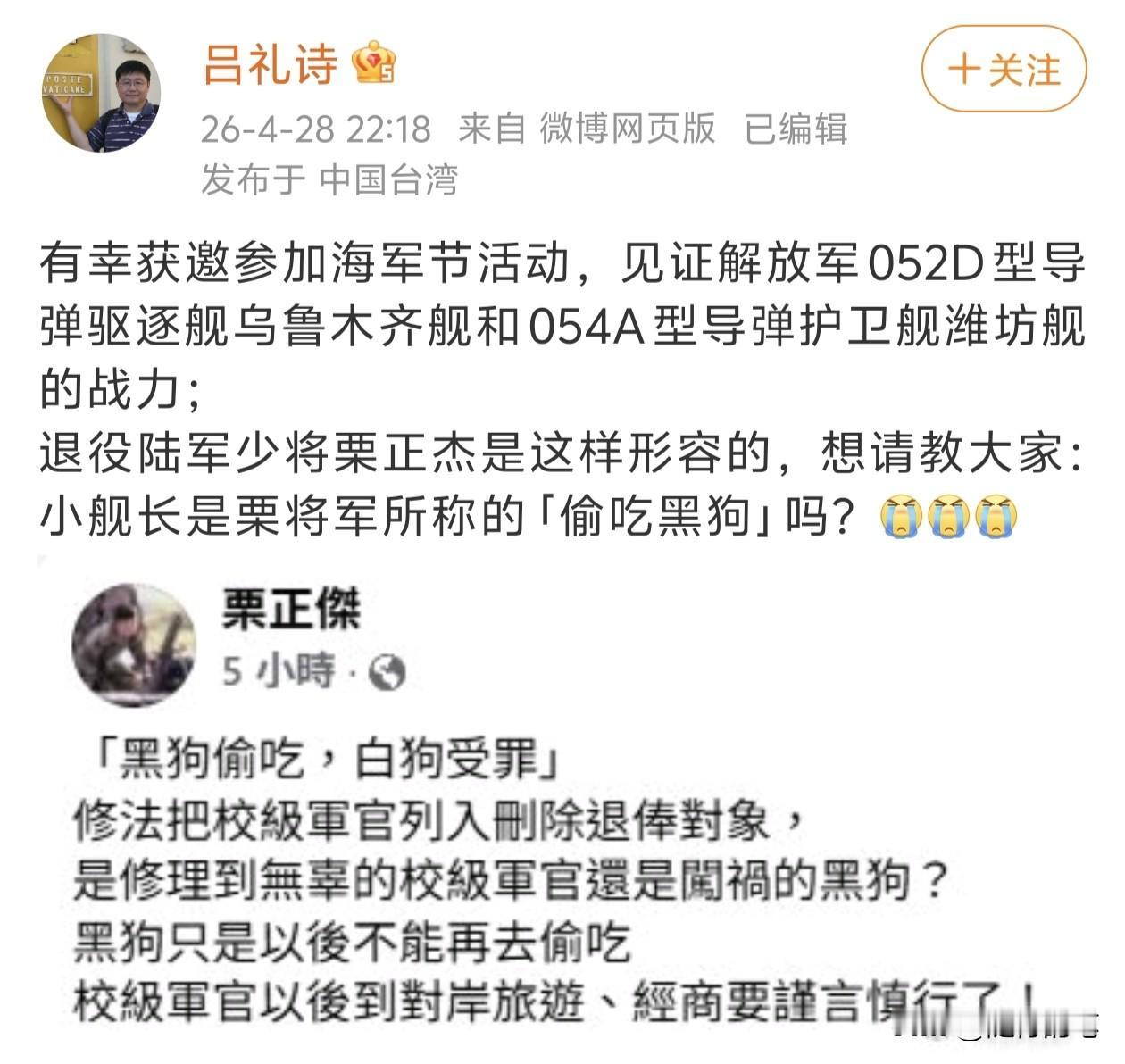 昨天吕礼诗发文,并挂出栗正杰对他阴阳怪气的贴文截图,直接点名栗正杰这样形容他来大陆参观解放军军舰活动。
