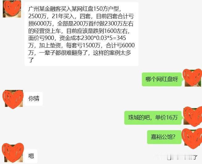 现在每套只能卖1600万左右,房价亏了900万,加上利息、税费、手续费大概600万,每套亏了1500万。