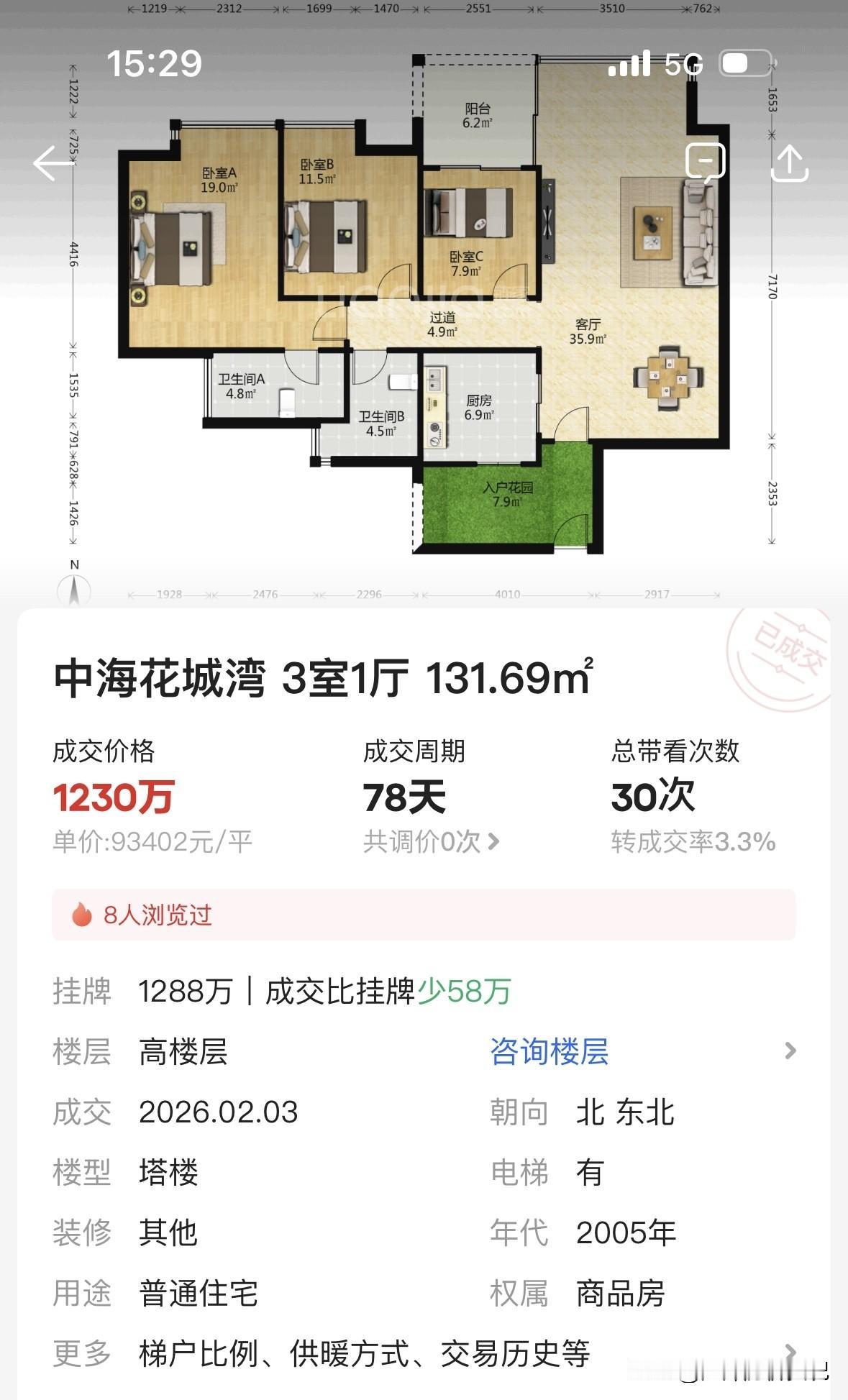 一套2026年2月成交,1230万,单价9万3。