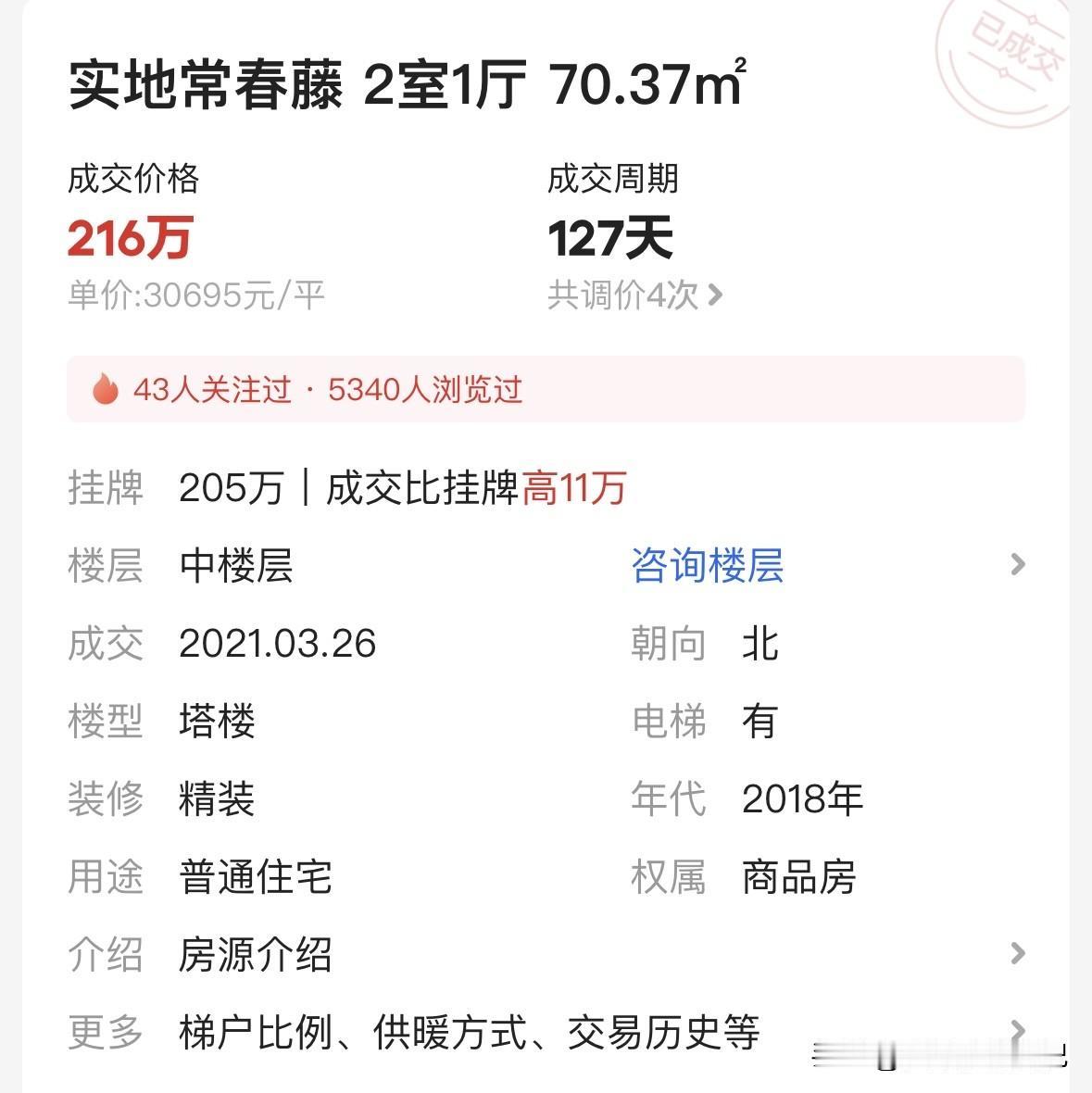 2021年3月,实地常春藤一套70平的两房,成交价216万。