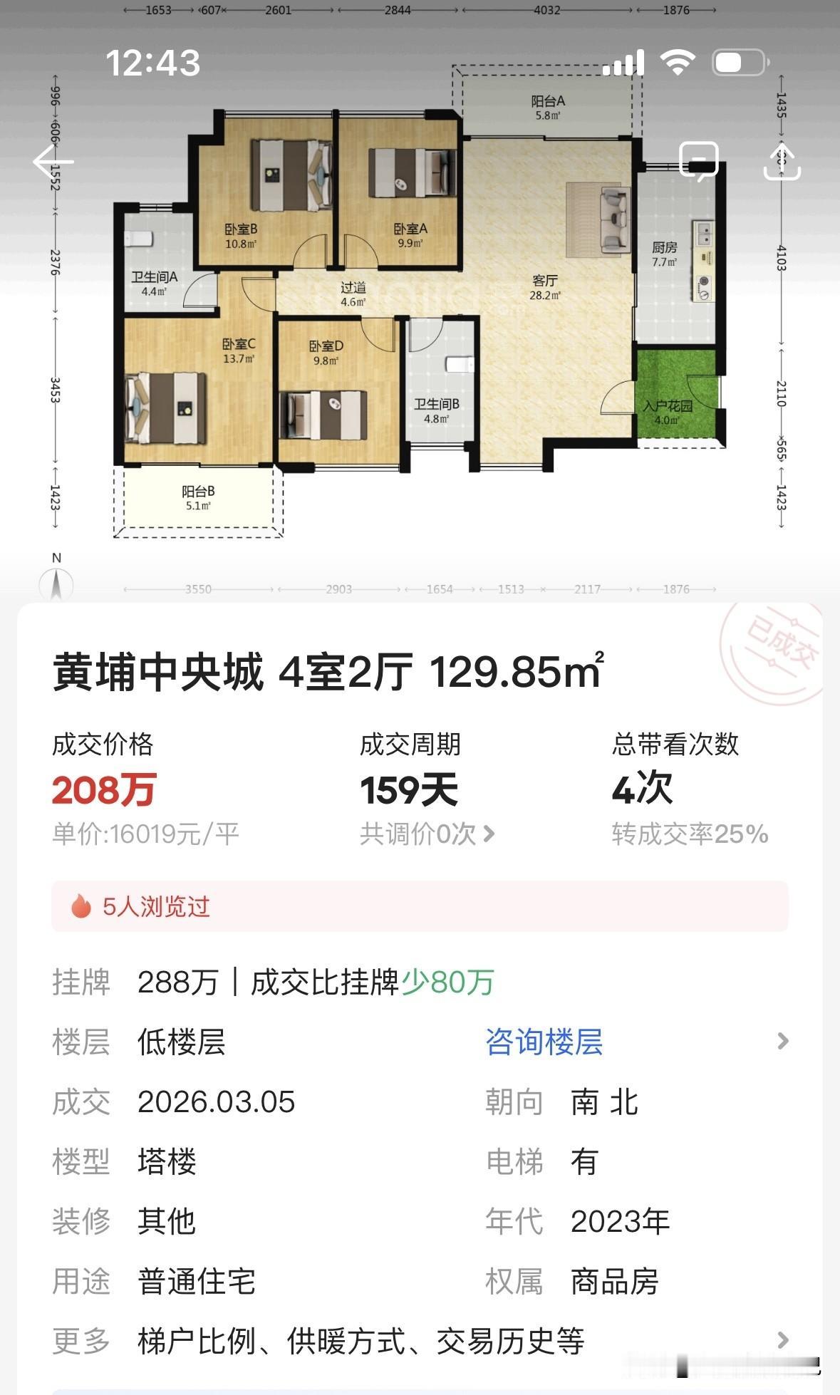 黄埔中央城最新成交的一套129平的四房,成交价208万。