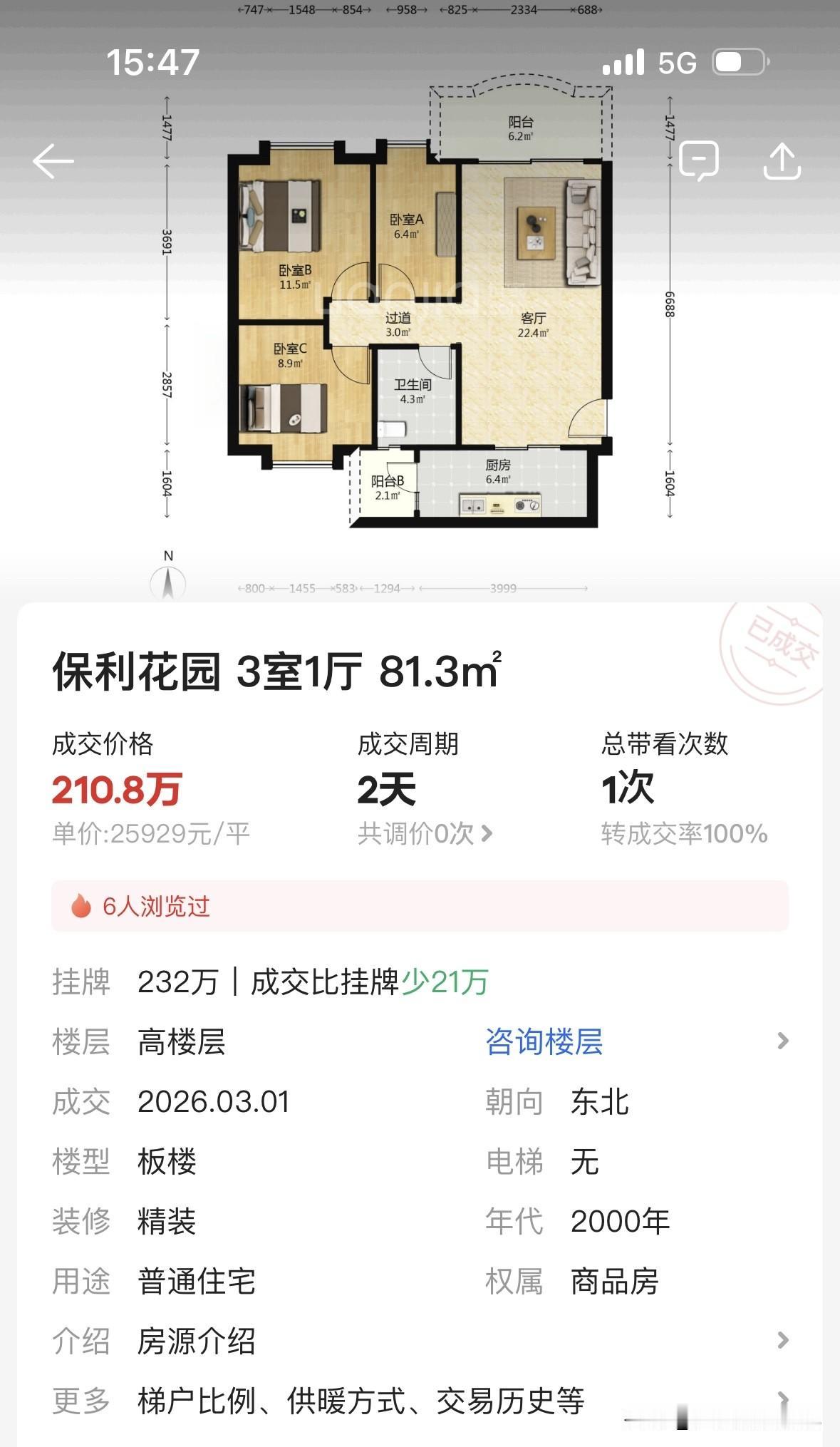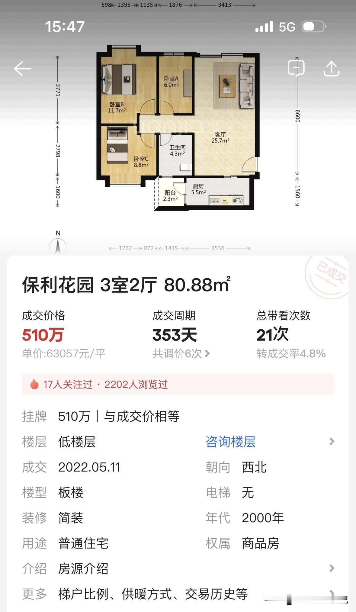 一套81平的三房,2022年5月成交,510万,单价六万三。