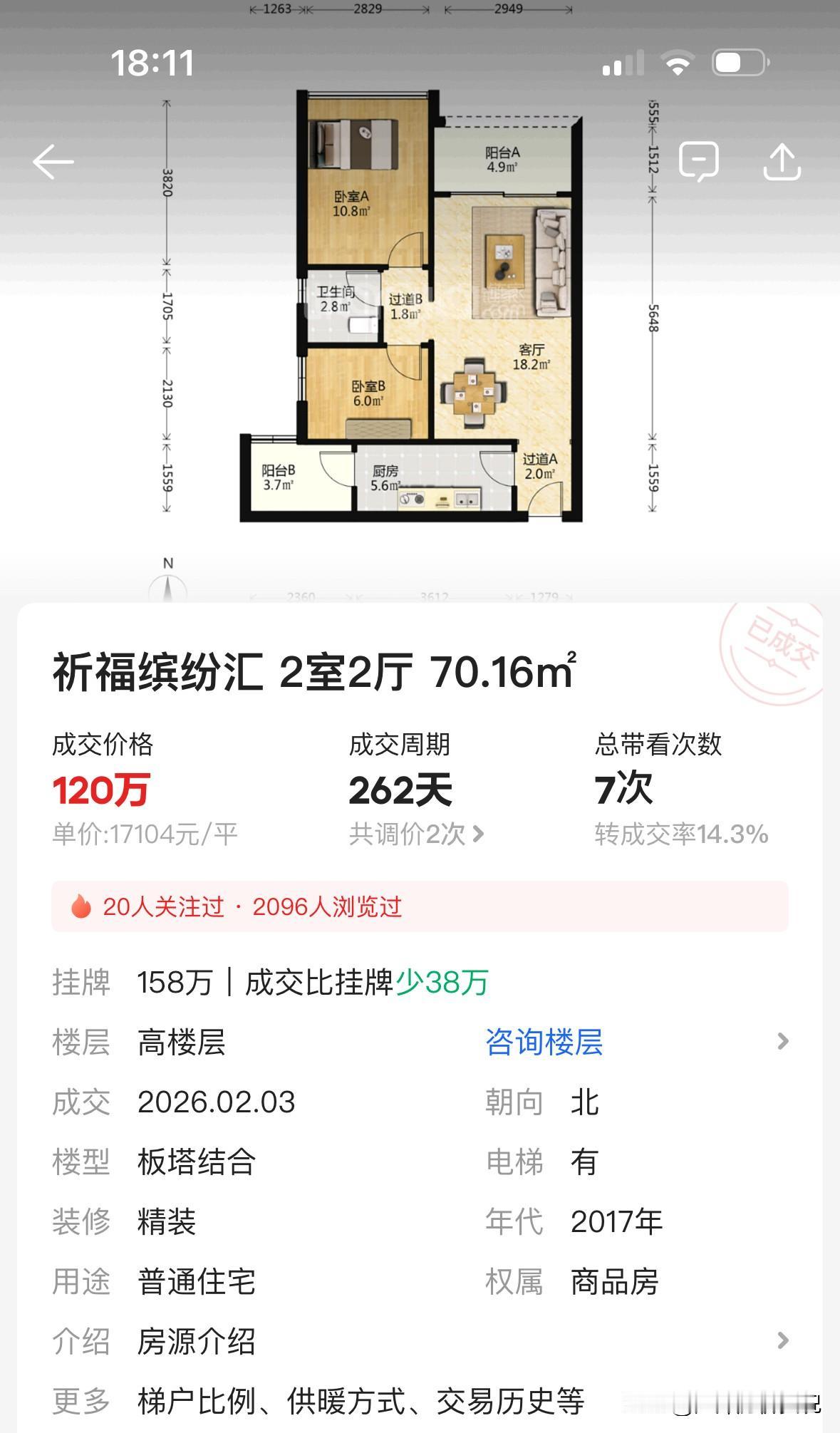 结果5年之后,2026年2月,小区一套同面积的70平方北向2房,最新成交价跌到了120万,单价只剩1.7万/平米。
