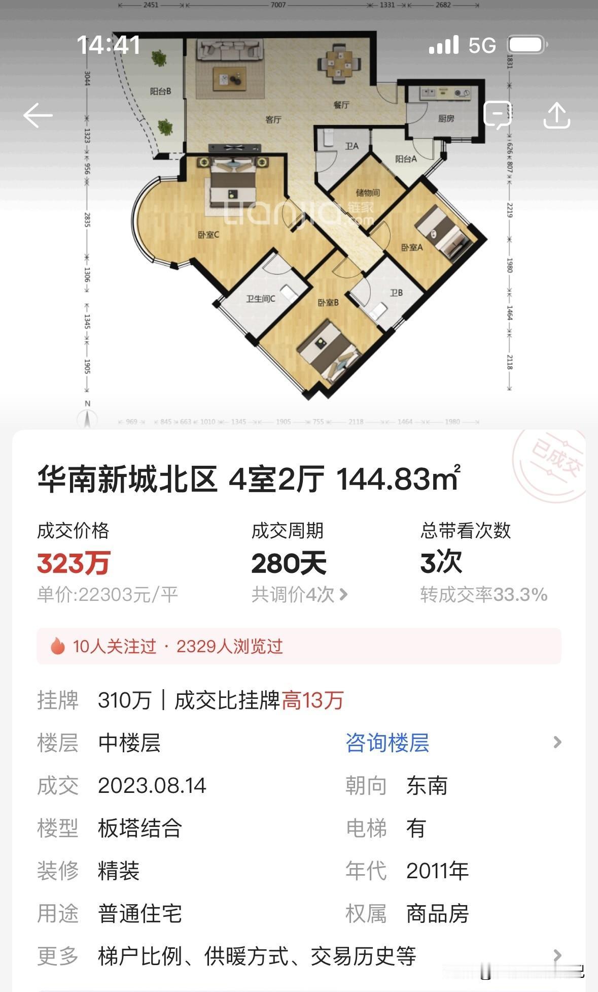 2023年8月,华南新城北区一套144.83平的四房,成交价323万,单价2.2万/平。
