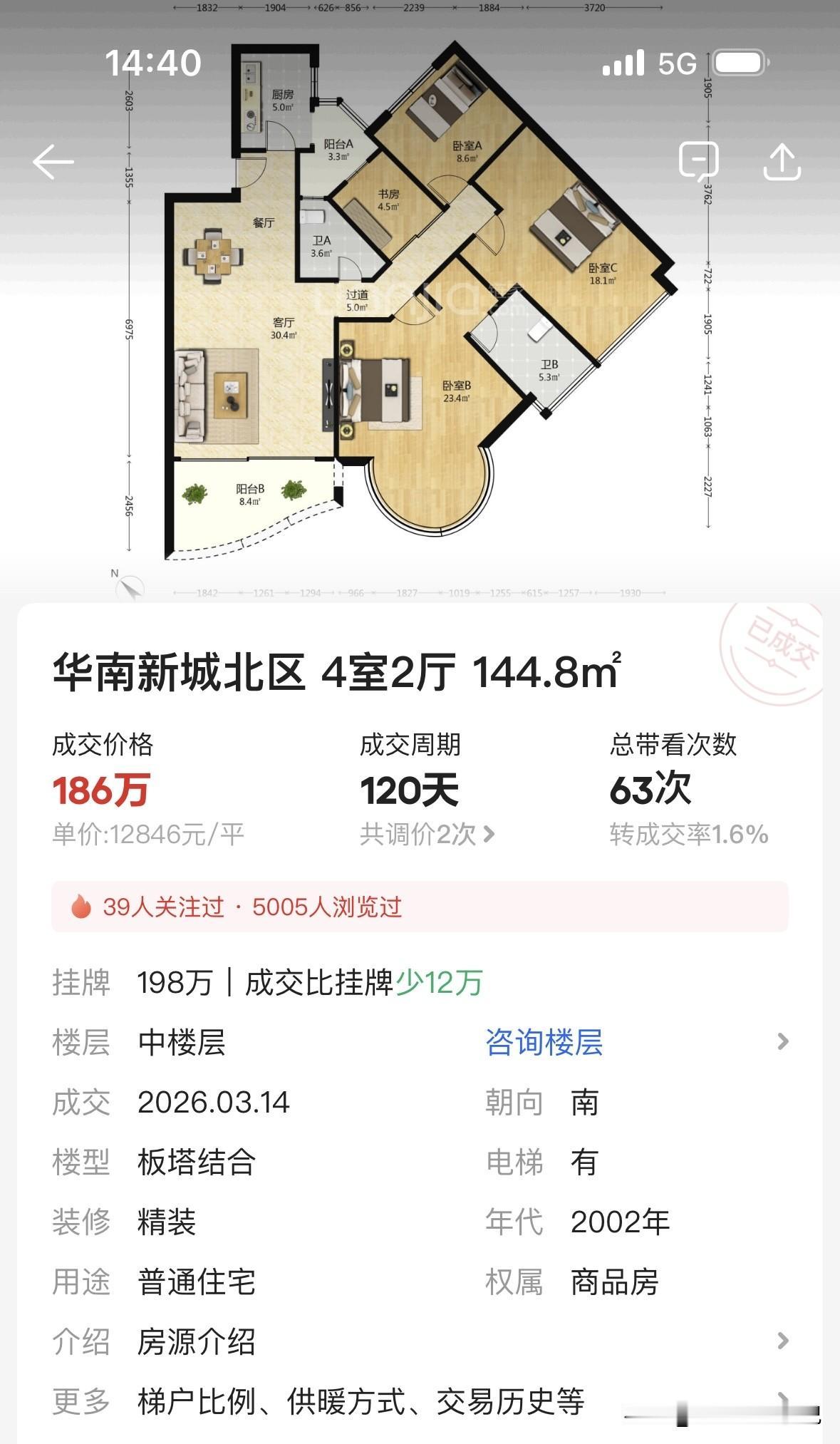 结果呢?两年半之后,2026年3月,小区一套几乎同面积的144.8平四房,成交价186万,单价1.28万/平。