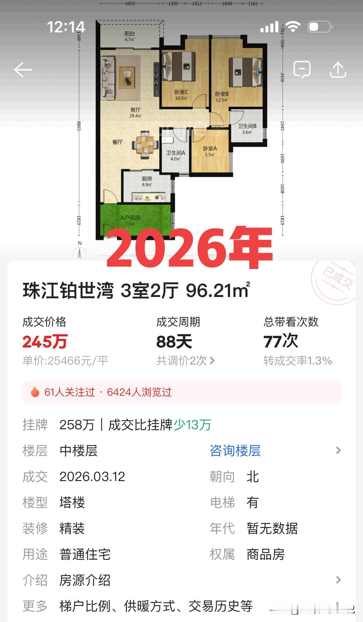 挂牌258万,88天成交,看房77次。77个人来看过,最后成交价比挂牌少了13万。