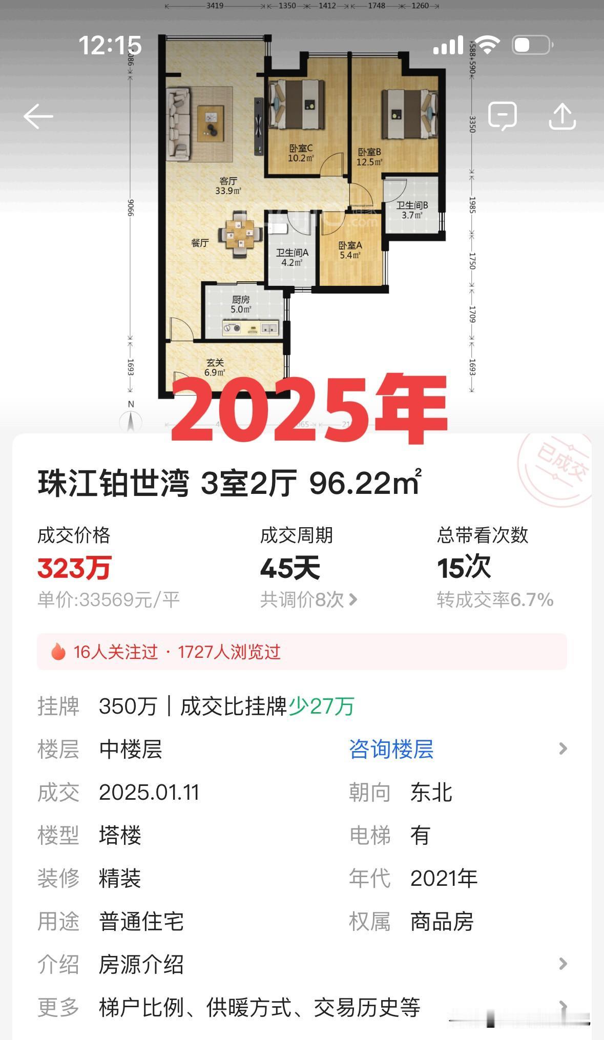 2025年1月,铂世湾一套96.22平的3房,成交价323万,单价3.3万/平。