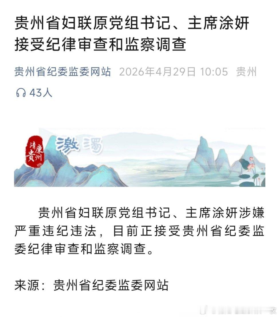 贵州省妇联原党组书记、主席涂妍接受纪律审查和监察调查!