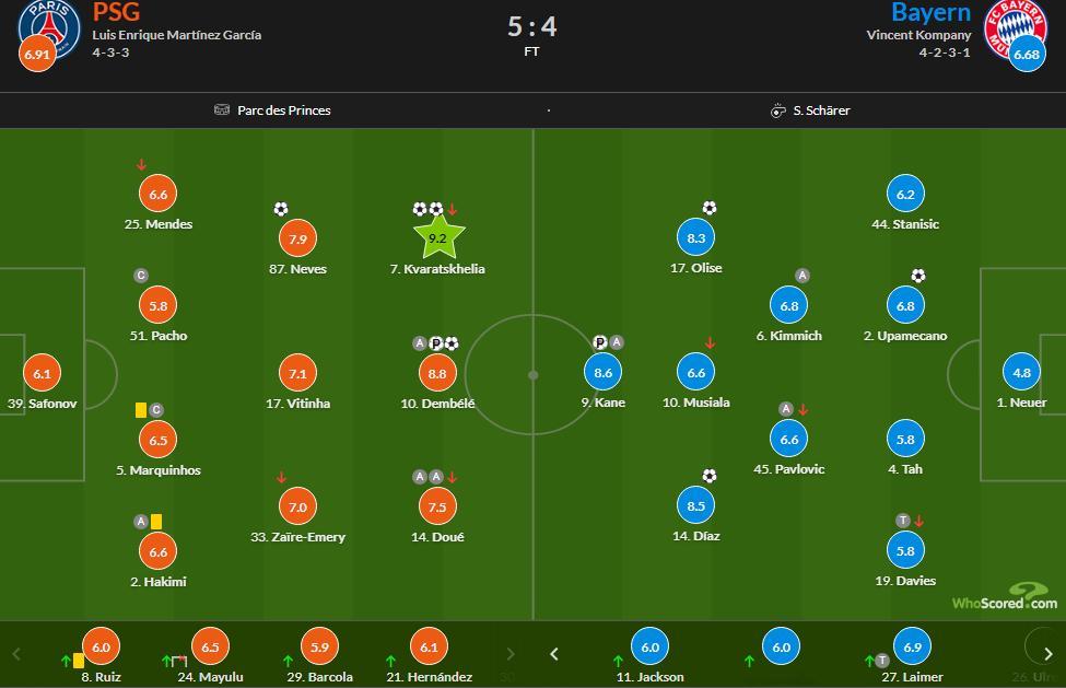 拜仁对阵巴黎圣日尔曼赛后,知名数据网站whoscored把本场比赛最佳球员评为巴黎攻击手克瓦拉茨赫利亚。