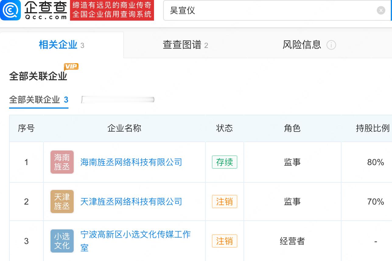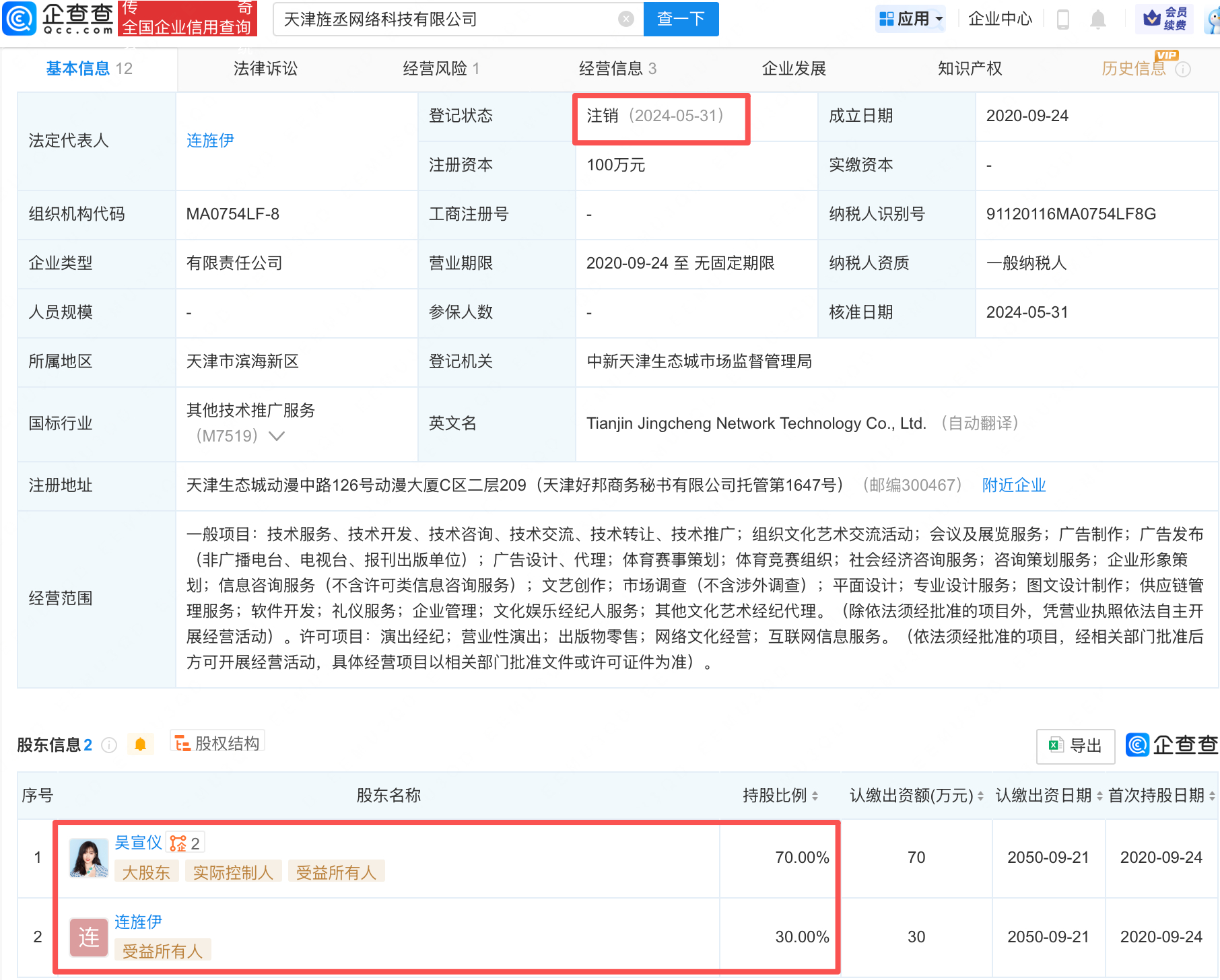 企查查APP显示,吴宣仪名下共有3家公司,其曾和妈妈连旌伊于2020年9月成立天津旌丞网络科技有限公司,该公司业务含文化娱乐经纪人服务、演出经纪、营业性演出等,二人分别持股70%、30%。2024年5月,该公司注销,原因为决议解散。目前,吴宣仪名下仅存续1家公司。