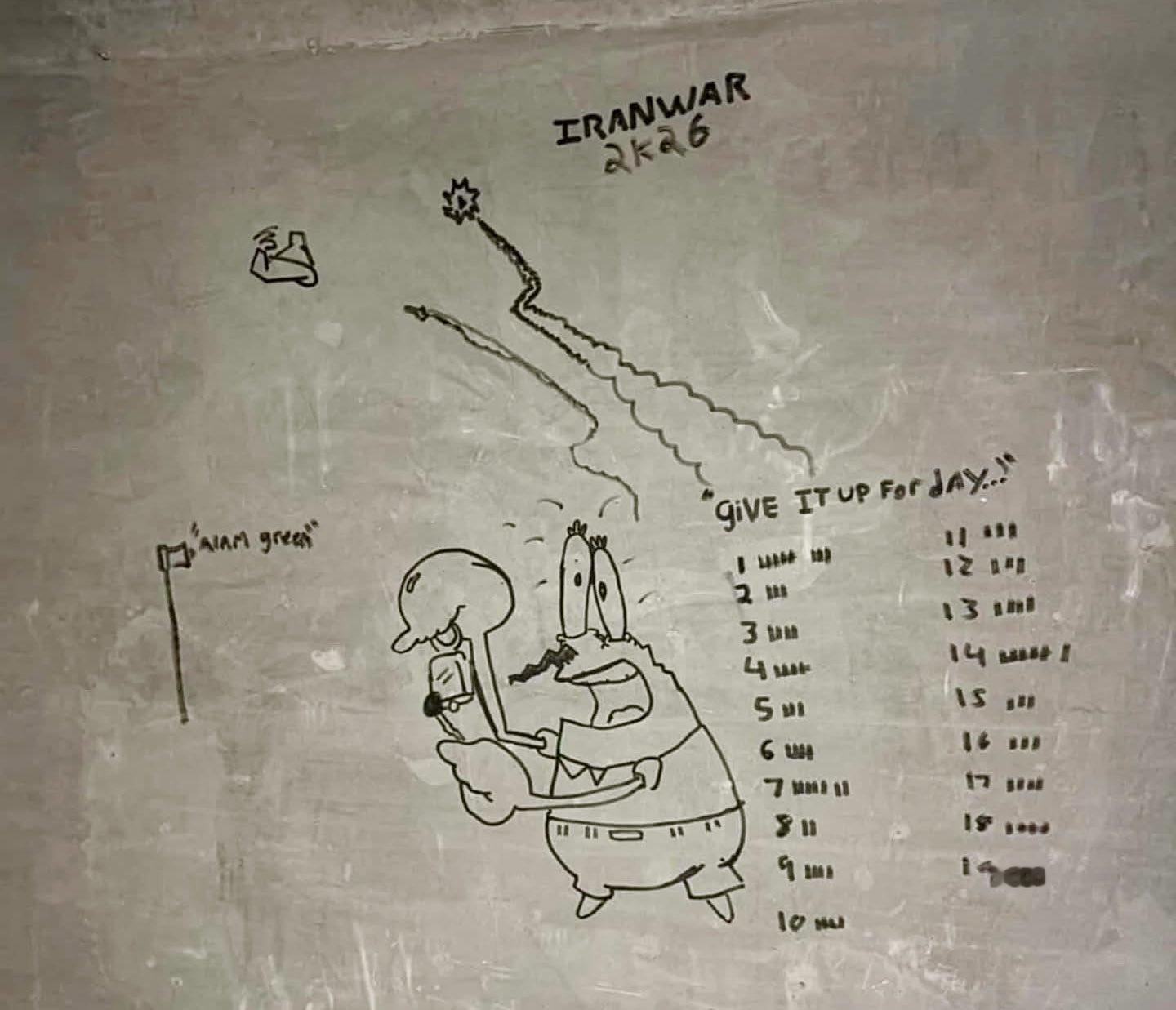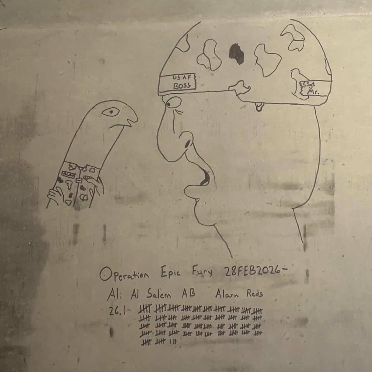 🔻图1是驻扎在科威特阿里萨利姆空军基地的美军,在伊朗战争期间创作的掩体艺术。🔻记录了超过 210 次空袭警报。🔻via clash report🔻之前也有其他报道,图2据称是约旦穆瓦法克·萨尔蒂空军基地内的美军掩体涂鸦,展示了一个始于 2026 年 2 月 28 日的“红色警报(空袭)”计数器。🔻刻痕标记是每日伊朗空袭警报的次数,19 天 77 次,由兵乔·斯纳菲拍摄,蟹老板敲钟的细节颇具巧思。🔻图3是美军中央司令部某空军基地的地堡涂鸦,由乔·斯纳菲于20天后的2026年3月20日拍摄。照片中的计数器显示为87。阿联酋退群震惊市场美国一学生当面怒斥以军恶行海外新鲜事中东现场直击
