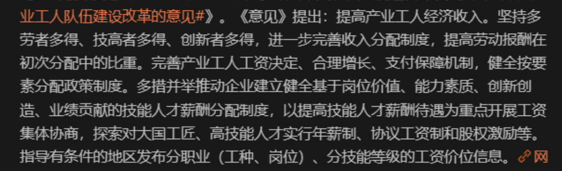 🔻图1这种观点的逻辑链条非常脆弱,本质上是把“企业利润高 → 员工收入高”当成必然因果,忽略了经济学中最核心的变量:分配制度保障。🔻企业利润(剩余索取权)归资本所有者(股东、管理层)。劳动者收入取决于劳动力供给、需求和议价能力,而非企业赚了多少。利润高时,企业完全可以把更多留作利润再投资、分红、回购股票或高管薪酬,而不是涨普通员工工资。🔻实证上,大量研究显示,高利润往往伴随劳动收入份额下降。企业市场势力强——比如高加成率、高利润时,更倾向于压低劳动份额,把收益分配给资本端。很多数据也印证:利润率高的行业/企业,劳动收入占比不一定高,反而可能因资本更强势而降低。🔻现实情况是:在决定劳动收入的层面,是分配制度(劳动合同法、社保、人才竞争)在起主要作用,而非利润率“决定”一切。充分竞争让企业更重视效率和人力资本投入,激烈竞争推动了规模扩大、技术迭代、自动化,也推动了劳动生产率提升,行业收入反而因技能需求和流动性而上升。🔻美国过去有很多高科技企业利润倒是爆炸式增长了,高管们也是赚的盆满钵满了,但是普通工人真实工资增长是超前还是滞后?差距主要在资本 vs 劳动的分配,和资本的利润没有必然的因果关系。🔻再强调一遍,消费者不要把自己屁股摆在资本的一边来讲话,高端制造利润率高,主要来自技术壁垒和规模经济,但员工收入提升更依赖技能溢价 + 劳动力市场竞争,而非企业利润本身。逃避中等收入陷阱的核心是全要素生产率提升 + 消费驱动,而非单纯“高利润”。过度追求高利润可能导致垄断、进入壁垒,反而抑制创新和大众消费。中国新能源把渗透率拉到全球领先,正是低利润高销量做大市场、提升全民红利的路径。🔻把“高利润 = 高员工收入”当作跨越中等收入陷阱的药方,是站在资本视角的简化幻想。它忽略了利润与工资的分配博弈,否定了竞争驱动生产率提升的正面作用。要提升劳动者收入,更应完善分配制度,依靠的是“提高产业工人经济收入。坚持多劳者多得、技高者多得、创新者多得,进一步完善收入分配制度,提高劳动报酬在初次分配中的比重”(图2),而不是寄希望于“企业利润高了自然发钱”这种天真逻辑。