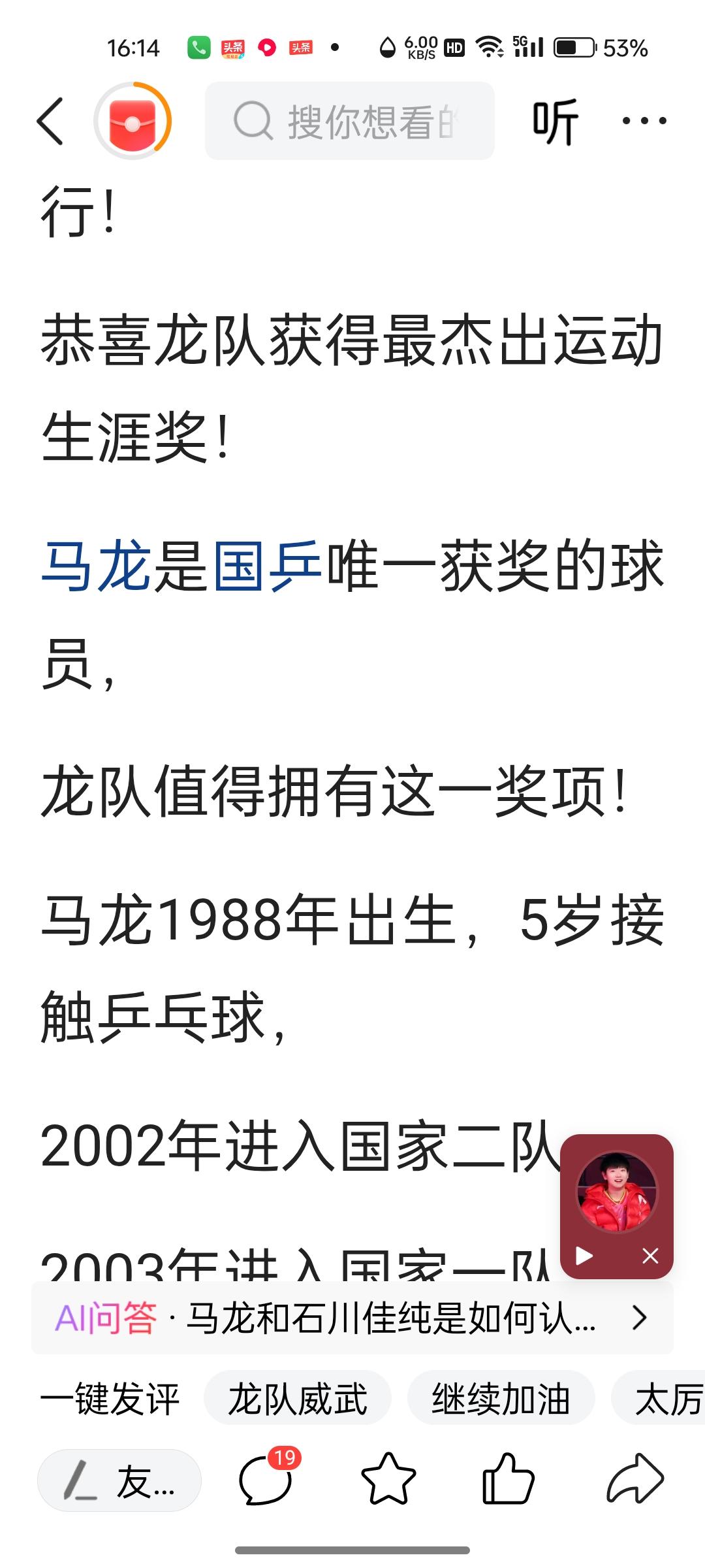 截止目前,六枚奥运金牌的傲人成绩是无人打破的,这六枚奥运金牌都是实打实的成绩,是马龙一拍一拍,浑汗如雨地打出来的,不是众粉丝天天喊叫着吹捧出来的,国际乒联授予马龙G0AT是实至名归的!还有2024年国际奥委会授予马龙是杰岀的运动生涯奖!网上也没有众粉丝天天喊着叫着喜欢马龙,也没有人天天吹着世界人民都喜欢马龙,可世界人民都晓得马龙,提起马龙众人都会肃然起敬!!