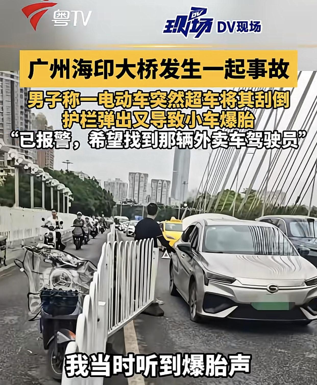 4月28日下午,广州海印大桥,一男子开电鸡正常行驶在非机动车道,没想到被后面一部“火箭发射”般的外卖电动车尾箱刮到,重重摔倒,人和车当场就把人行道护栏撞烂。由于冲击力太大,护栏还把对面一辆小车的车胎扎破。