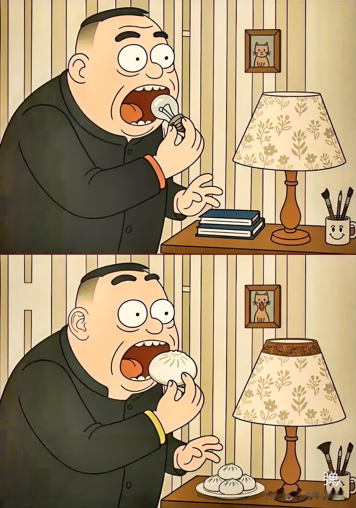 考眼力 找岀8处不同[灵光一闪] 去食堂吃早餐,打到个包子,皮厚得像轮胎。 我