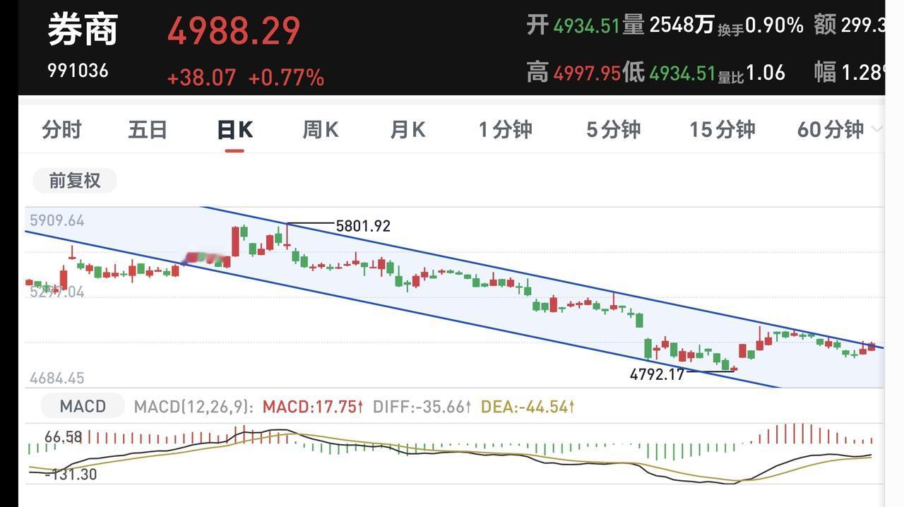 券商板块日线级别处于下跌通道中,昨天的上涨来到了这个下跌通道上轨线上,今天注意观察能不能突破这条上轨线,如果实现有效突破,轻空仓的人可以打入底仓。