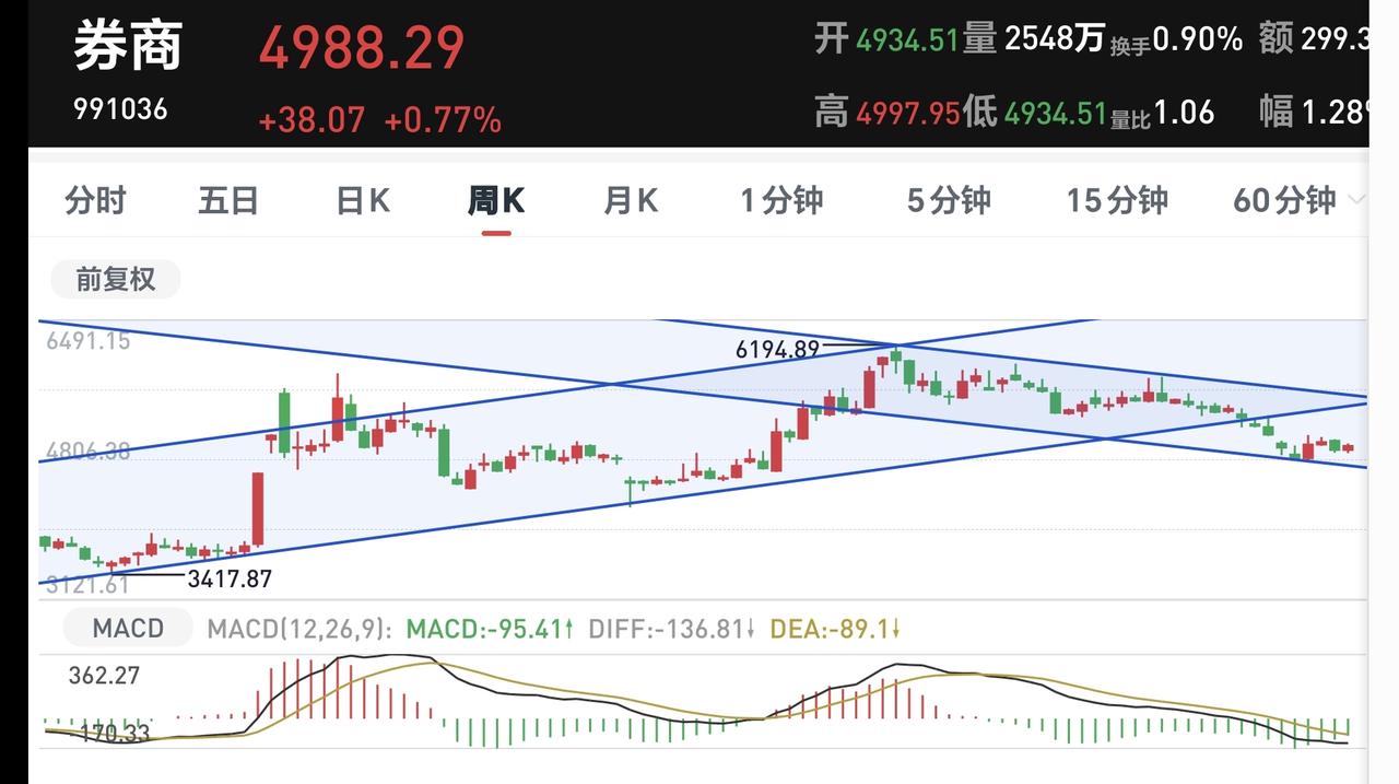 券商板块周线级别处于下跌通道中,距离下跌通道的下轨线更近一些,小幅度的上涨都改变不了这个板块周线级别的下跌趋势,长线的人还需要耐心等待。