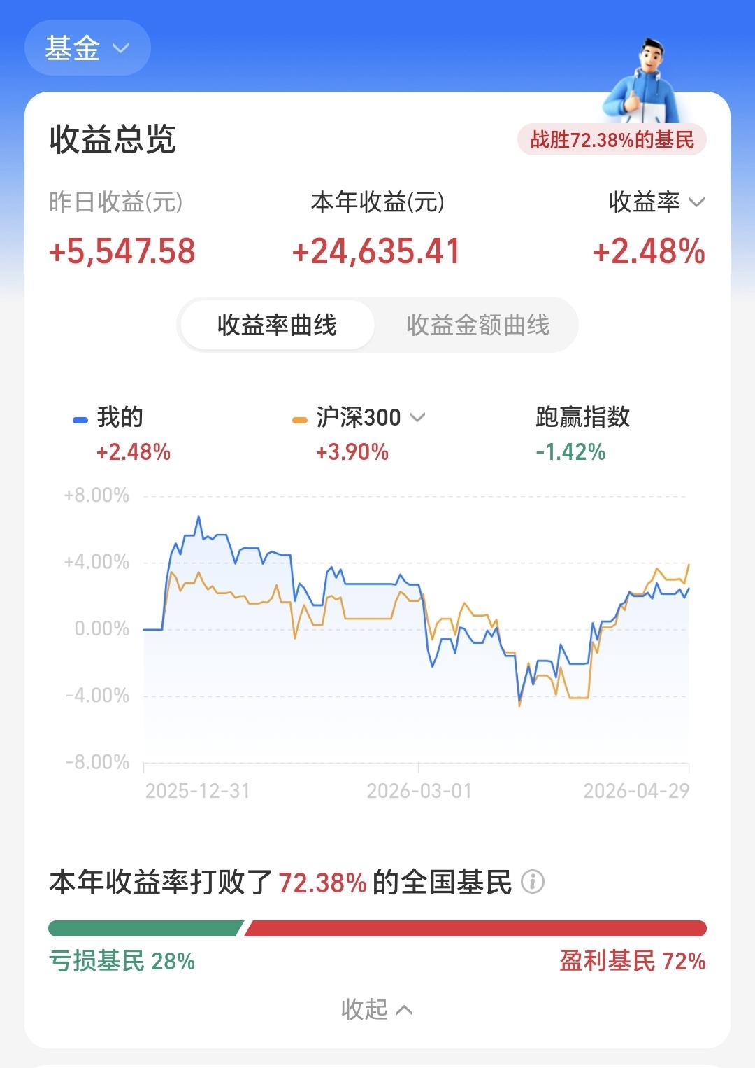 今年以来收益24635元,收益率2.48%,跑赢了全国72.38%的基民,跑输了沪深300指数3.90%的上涨幅度。