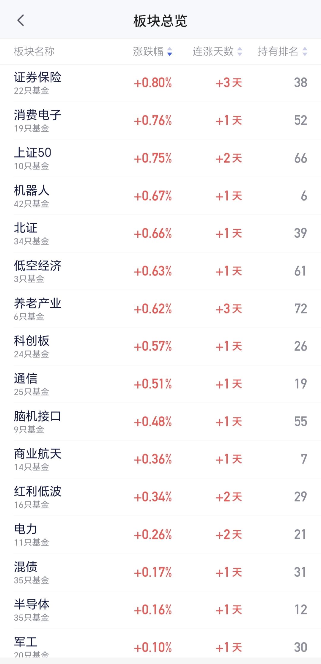 昨天证券保险板块上涨了0.80%,是连续第三个交易日上涨,持有人数在所有板块当中排名第38位。