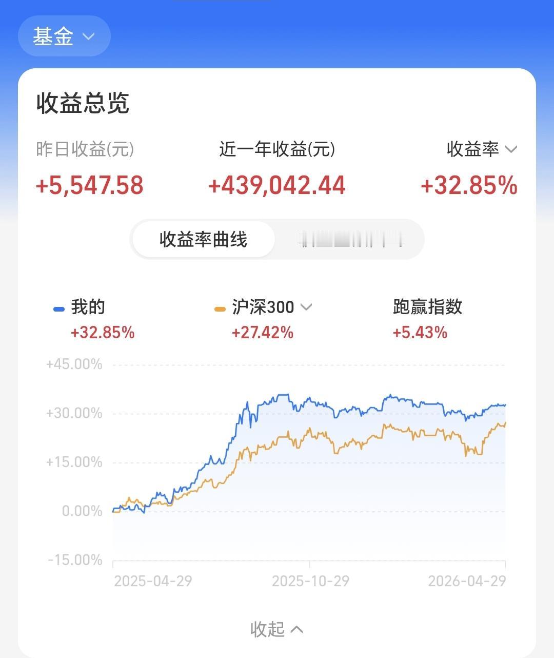 近一年以来收益439042元,收益率32.85%,跑赢了沪深300指数27.42%的上涨幅度。