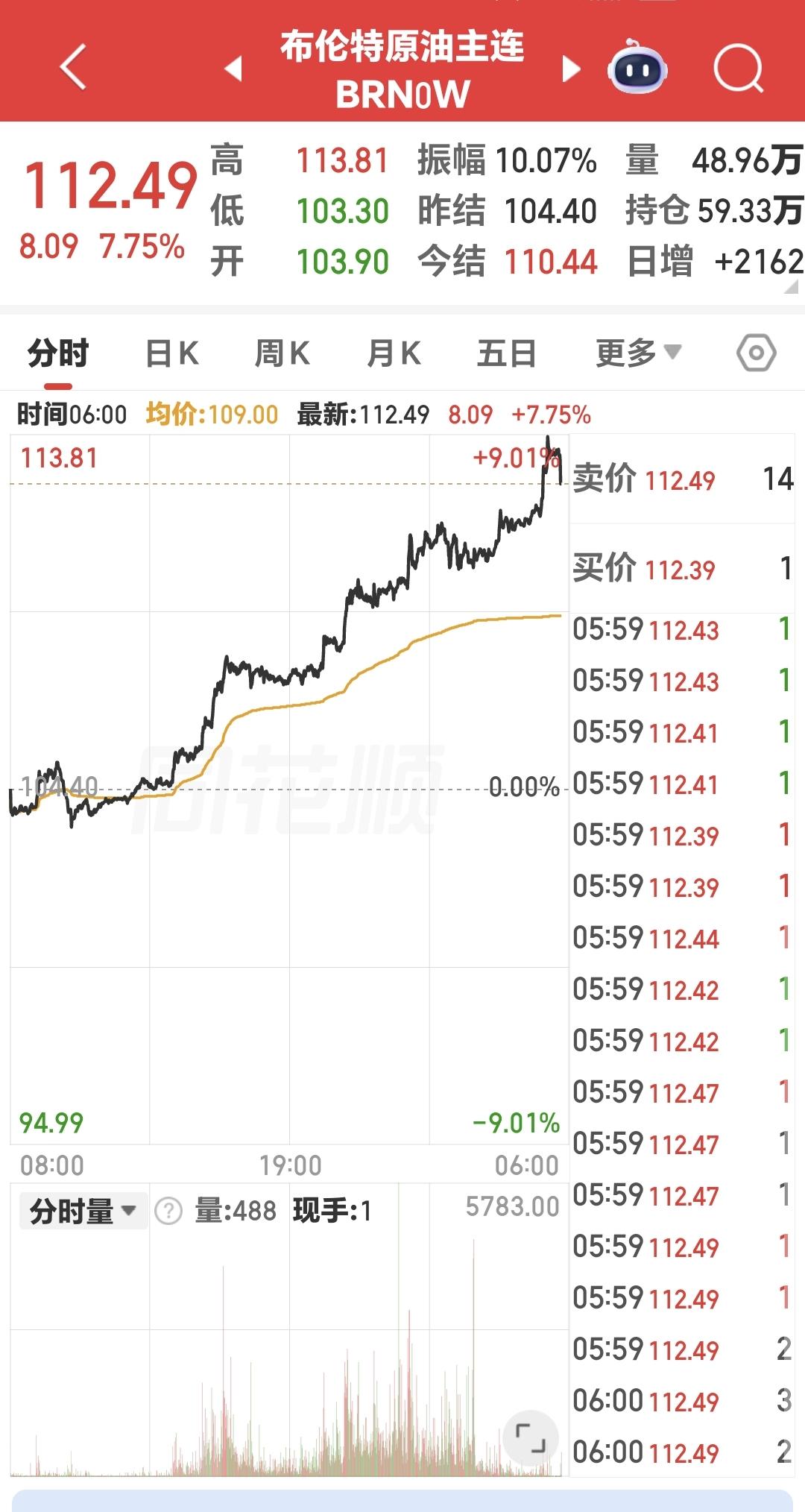 布伦特原油昨天晚上大涨,上涨了7.75%,报于112.49美元,这是近期第一次站上110美元。