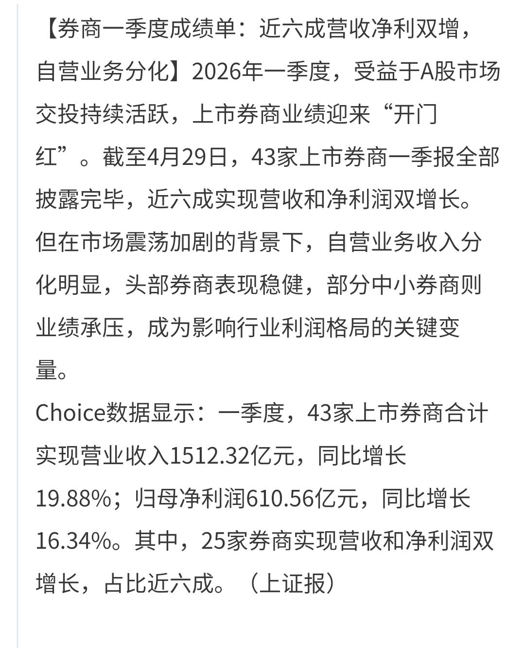 一季度,43家上市券商合计实现营业收入1512.32亿元,同比增长19.88%;归母净利润610.56亿元,同比增长16.34%。其中,25家券商实现营收和净利润双增长,占比近六成。(来源:上证报)