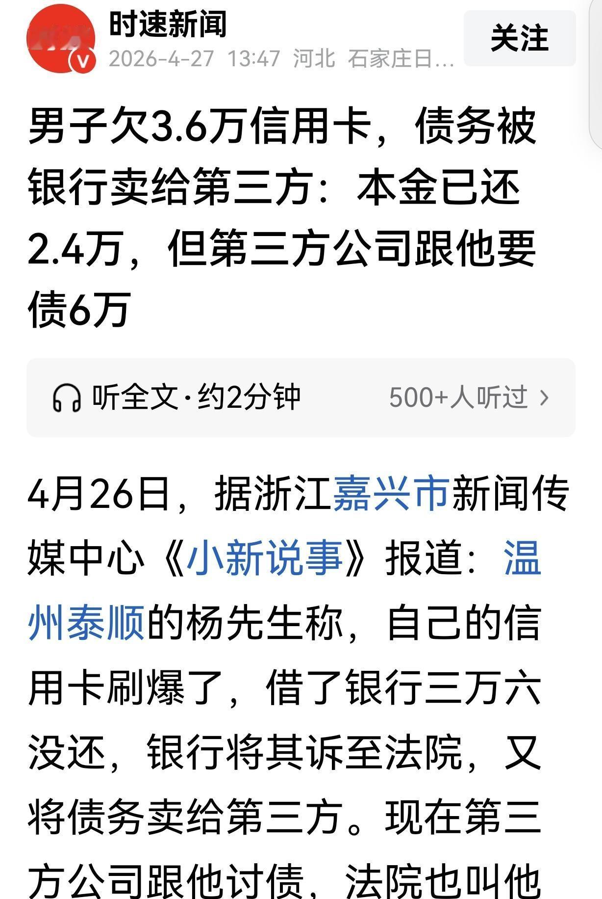 时速新闻2026-4-27《男子欠3.6万信用卡,债务被银行卖给第三方:本金已还2.4万,但第三方公司跟他要债6万》