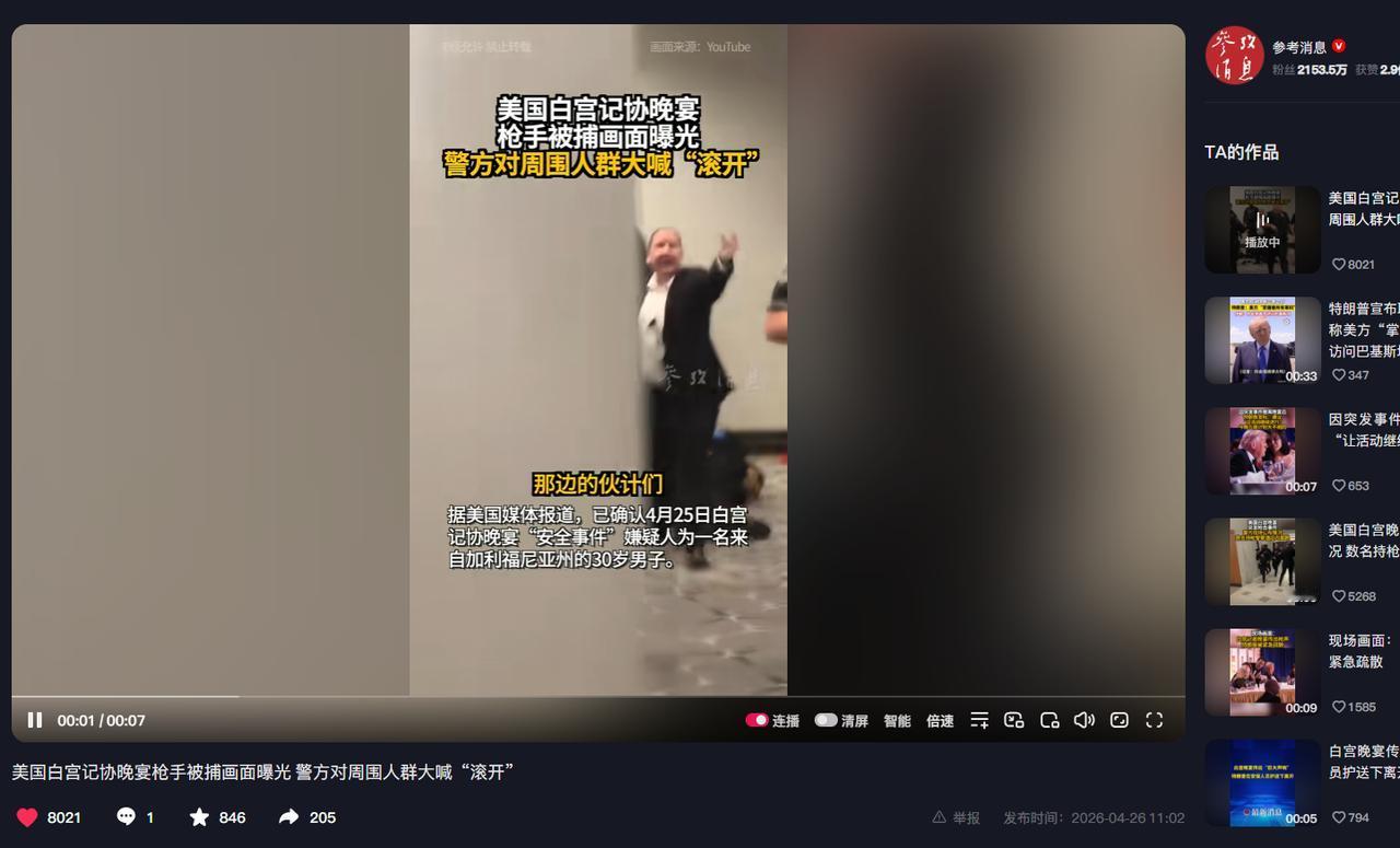 白宫晚宴枪击案发生后,现场相关视频爆火全网。