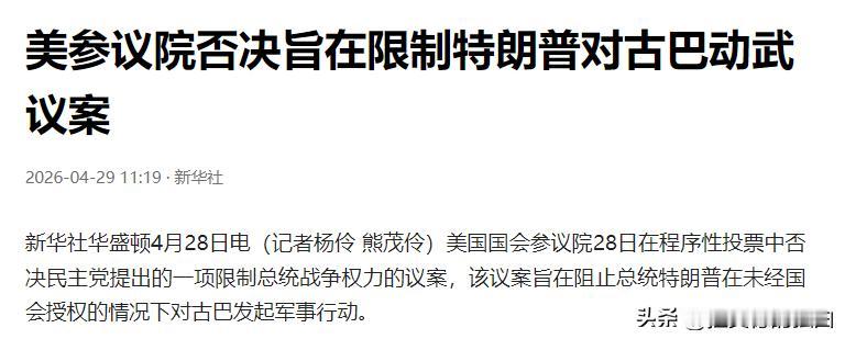 当地时间 4 月 28 日,美国国会参议院以 51 票对 47 票的程序性投票结果,否决了民主党人提出的一项限制总统战争权力的决议。这项决议旨在明确禁止总统特朗普在未经国会授权的情况下,对古巴发动任何形式的军事行动。此次投票几乎完全按照党派划分,但也出现了罕见的跨党投票现象,为这场关乎加勒比地区和平的博弈增添了复杂色彩。