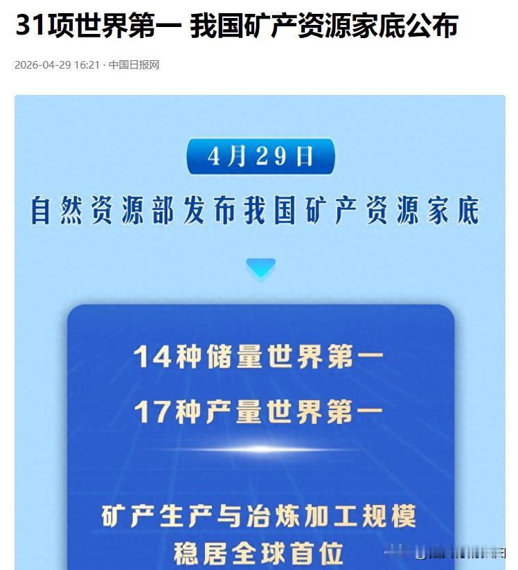 4 月 29 日,自然资源部正式发布我国最新矿产资源家底,一组亮眼的数据瞬间引发全球关注:我国拿下 31 项矿产资源领域的世界第一,用实打实的勘探成果与产业实力,筑牢了国家能源资源安全的根基,也向世界展现了中国矿业发展的硬核实力。