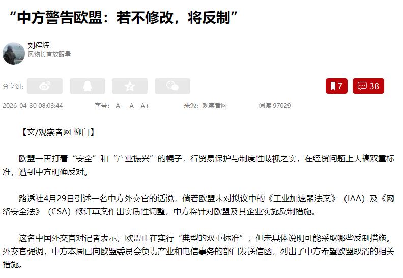 4 月 29 日紧急发声:欧盟打着 “安全” 幌子搞贸易保护、大玩双重标准,已触碰中方红线!若不实质性修改两项违规法案,反制措施即刻落地,欧盟企业将首当其冲!