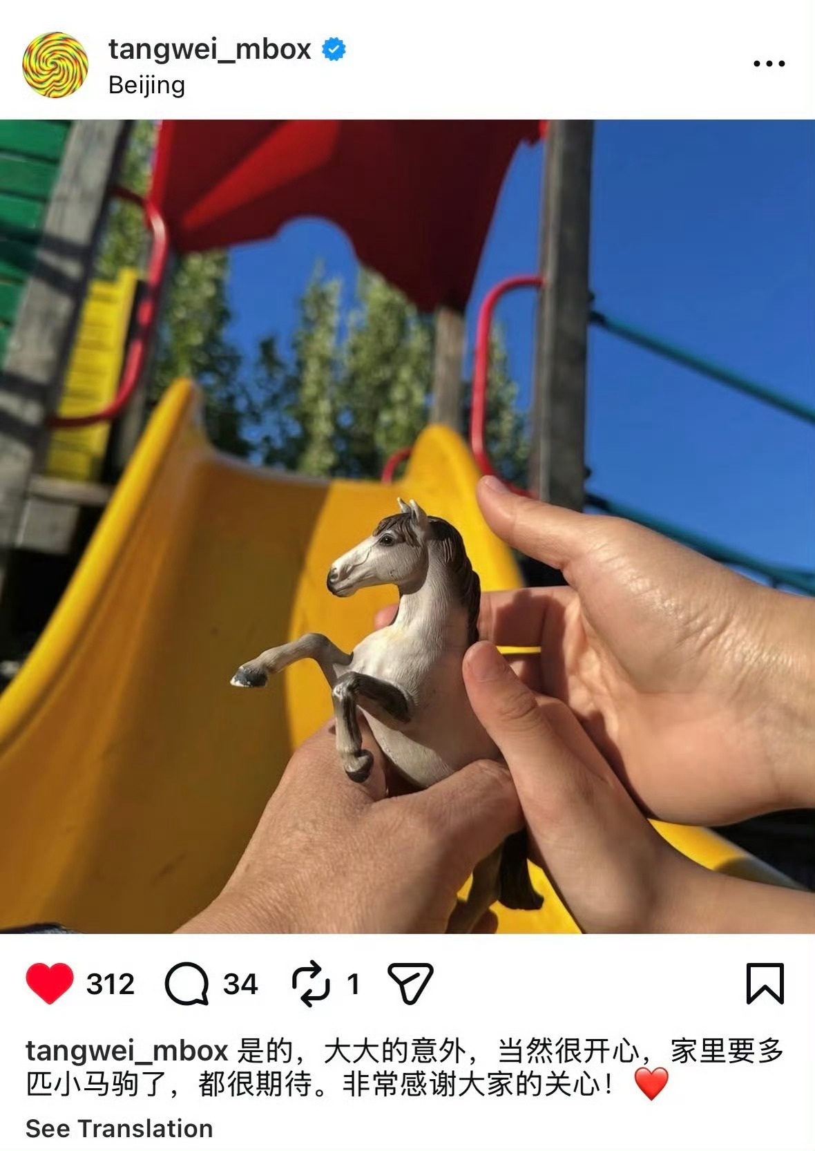 汤唯确认怀二胎4月29日,演员汤唯在个人社交平台发布一张小马驹照片,正式宣布怀上二胎喜讯。她在配文中写道:“是的,大大的意外,当然很开心,家里要多匹小马驹了,都很期待。”