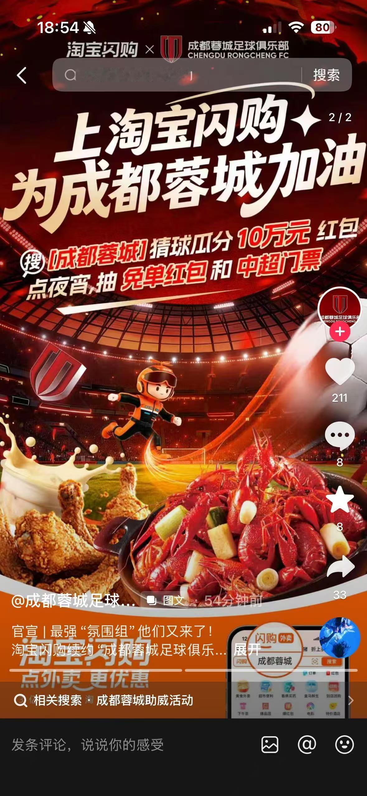 淘宝闪购赞助蓉城了!感谢淘宝闪购!之前领的红包点了夜宵周边入手,嗡嗡嗡好精致。而且第一期猜球分了25块,开心。现在第二场猜球又来了,我再冲一单,万一再中呢 成都蓉城成都蓉城淘宝闪购应援成都蓉城