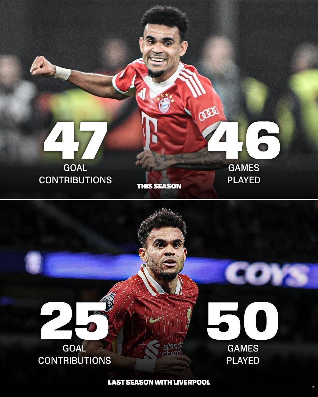 利物浦50场25球+助攻拜仁 46场47球球+助攻迪亚斯升级到了另一个阶段