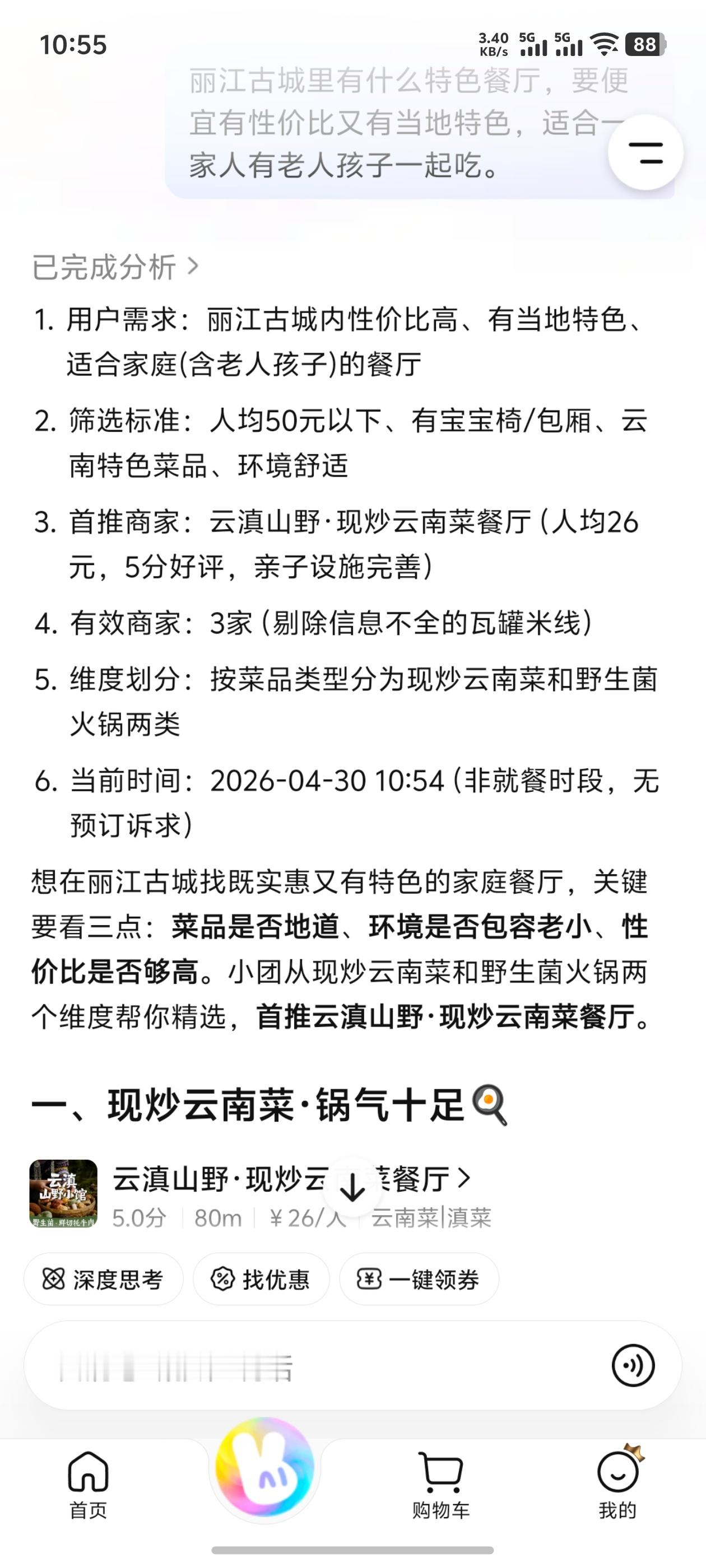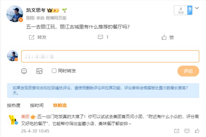 不小心触发了真能解决生活问题的AI五一出门游玩全程纠结,路线、美食、打卡地样样头疼,忍不住发微博吐槽出游困难症,没想到意外收到美团官方评论推荐,随手去体验了一把美团小团,直接被狠狠惊艳到。这款美团专属 AI 助手真的太懂普通人的出行需求,对话式交互特别省心,有任何问题直接提问就能快速解答。最让我惊喜的是它的美食推荐,精准匹配景区周边高口碑餐厅,避开网红刺客和踩雷小店。毕竟美团深耕本地生活多年,积累了海量餐饮大数据,结合真实用户评价,推荐逻辑特别贴合日常口味,靠谱度拉满。日常查攻略、找门店、出行规划都能一键搞定,覆盖吃喝玩乐住行购全场景。使用方式很简单,要么在美团首页搜索框关键词查询,也能点击首页底部【小团】tab,一键开启 AI 智能搜索。原来实用的 AI 就在身边,轻松化解各种出行难题。