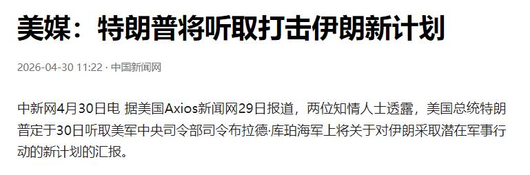 据美国阿克西奥斯新闻网站 4 月 29 日援引多名知情人士消息报道,美国总统特朗普将于当地时间 4 月 30 日,听取美军中央司令部司令布拉德・库珀关于对伊朗潜在军事行动新方案的专项汇报,这一核心消息已得到新华社、中国新闻网等权威媒体的同步核实与披露。