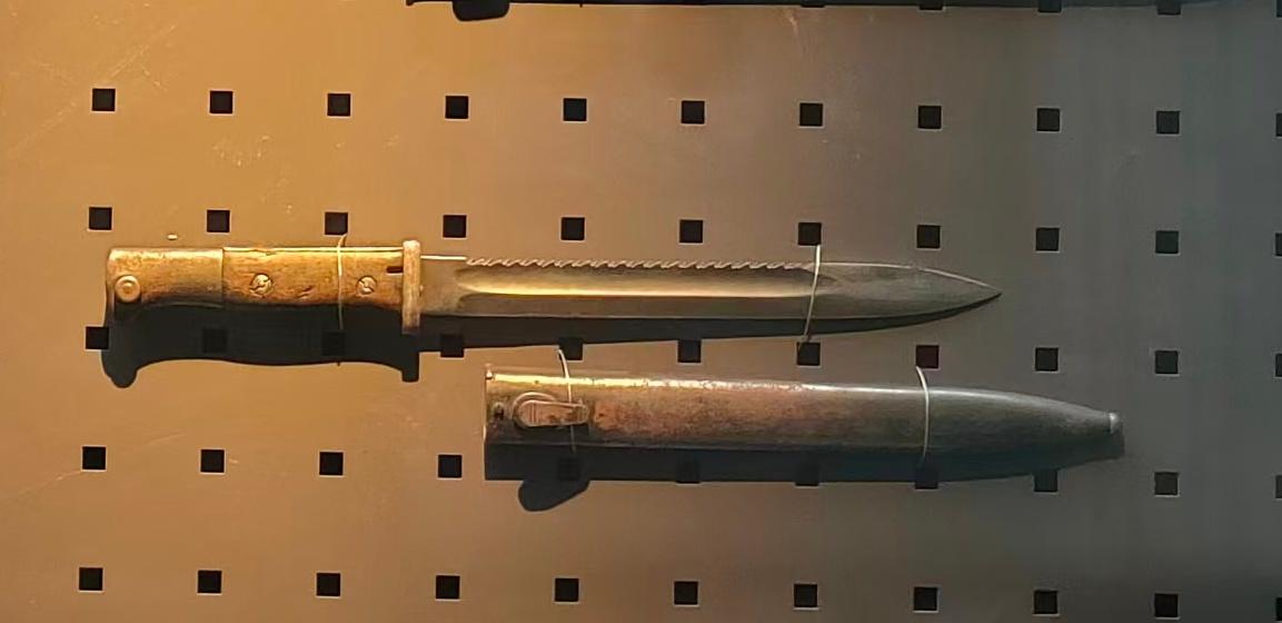 这就是曾让一战协约国忌惮不已的德军背齿刺刀。协约国极大的宣传背齿刺刀的恐怖。为了在士兵中塑造德军的“野蛮”形象,协约国曾宣传这种背齿刺刀可以切开伤者的骨骼,并造成无法愈合的伤口。这也极大的增加了士兵对这种刺刀的恐惧。