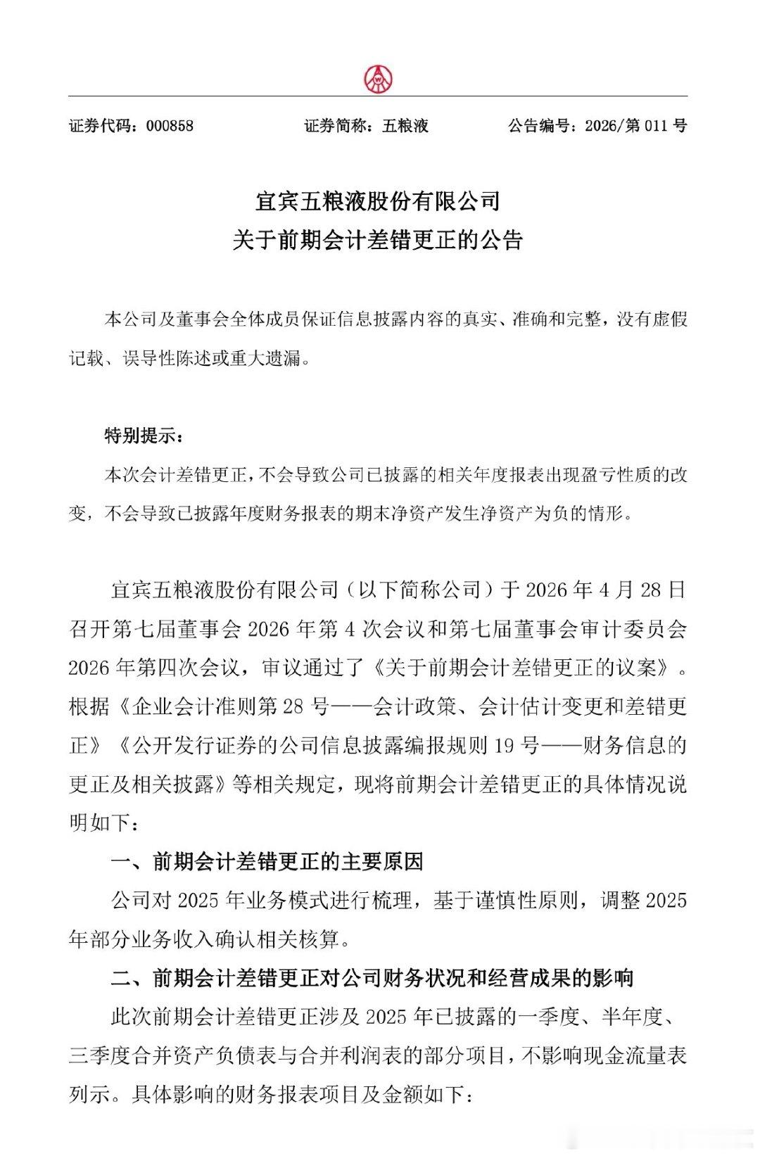 公司公告:前期会计差错更正的主要原因公司对2025年业务模式进行梳理,基于谨慎性原则,调整2025年部分业务收入确认相关核算。