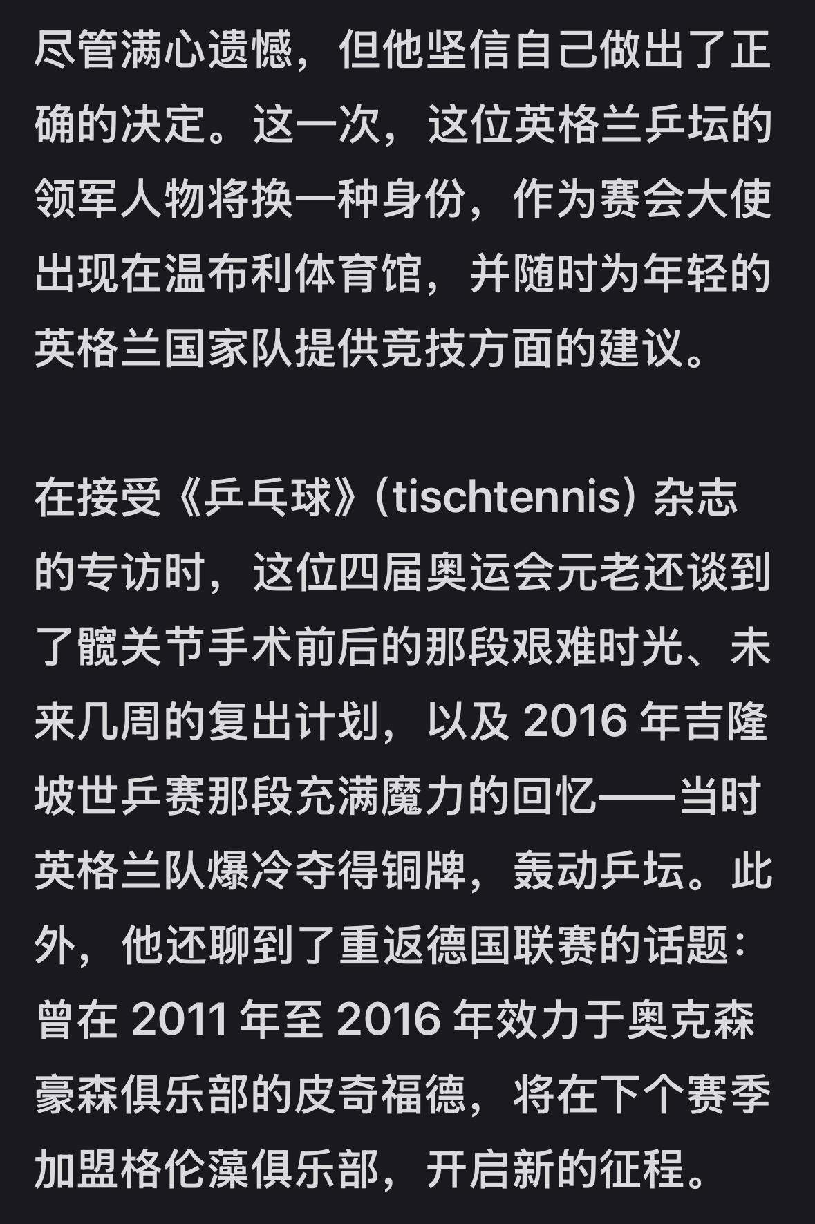 原来皮切福德在去年底做了髋关节手术,原本打算伦敦世乒赛复出,