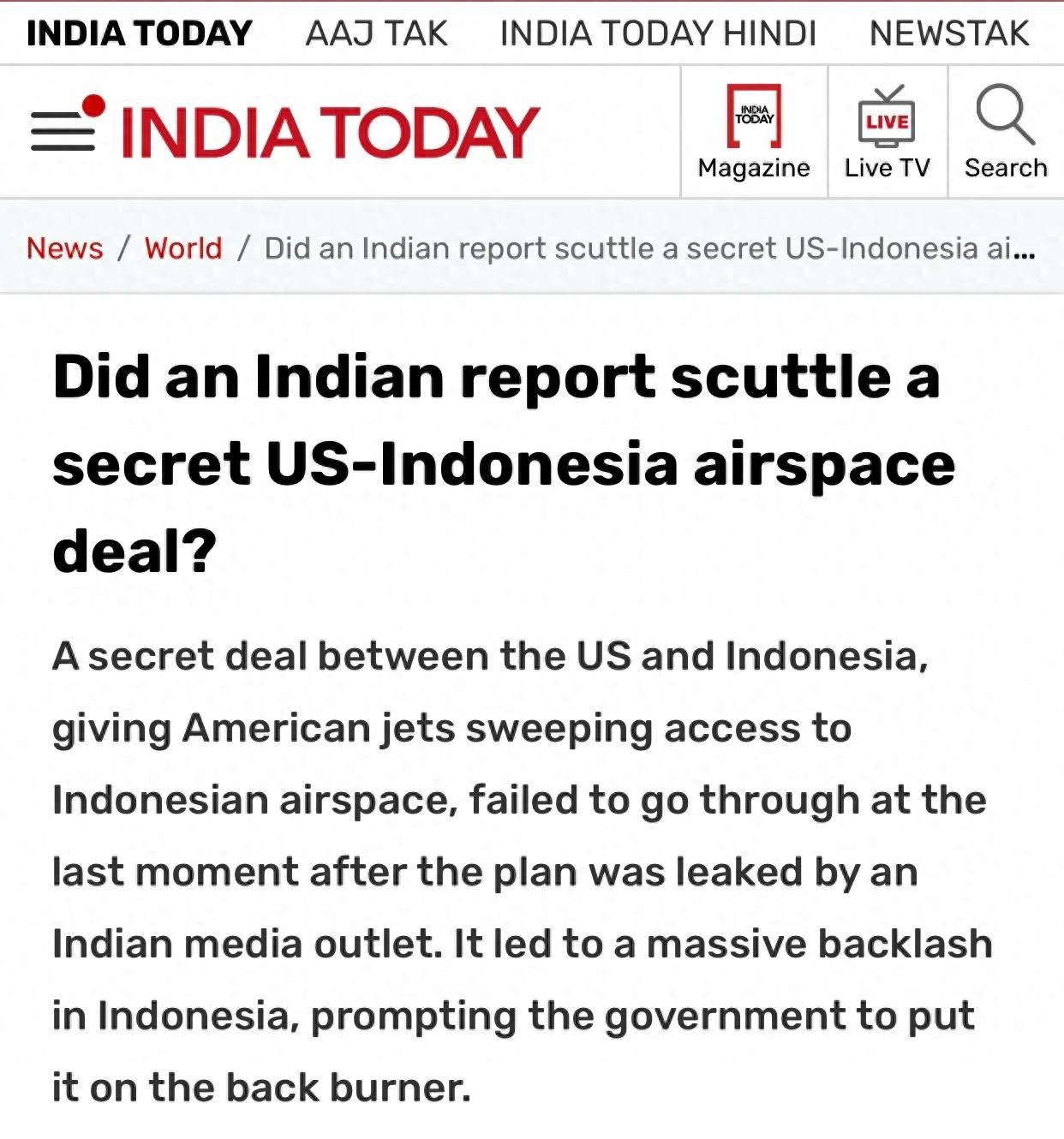 报道的原标题是《Did an Indian report scuttle a secret US-Indonesia airspace deal?》(印度的报道是否泄露了美国-印度尼西亚的秘密领空协议?)。