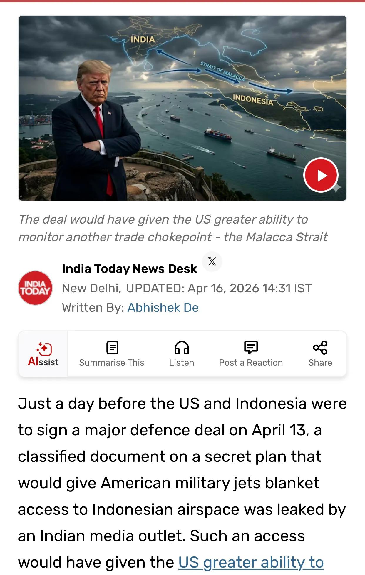 印度《今日印度》官网4月16日报道:就在美国和印度尼西亚原定于4月13日签署一项重大防务协议的前一天,一份关于一项秘密计划的机密文件被一家印度媒体泄露,该计划将赋予美国军用飞机进入印度尼西亚领空的全面权限。