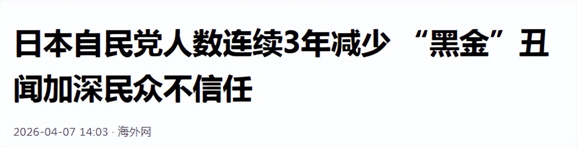 参考资料:海外网《日本自民党人数连续3年减少 “黑金”丑闻加深民众不信任》发布时间:2026.4.7