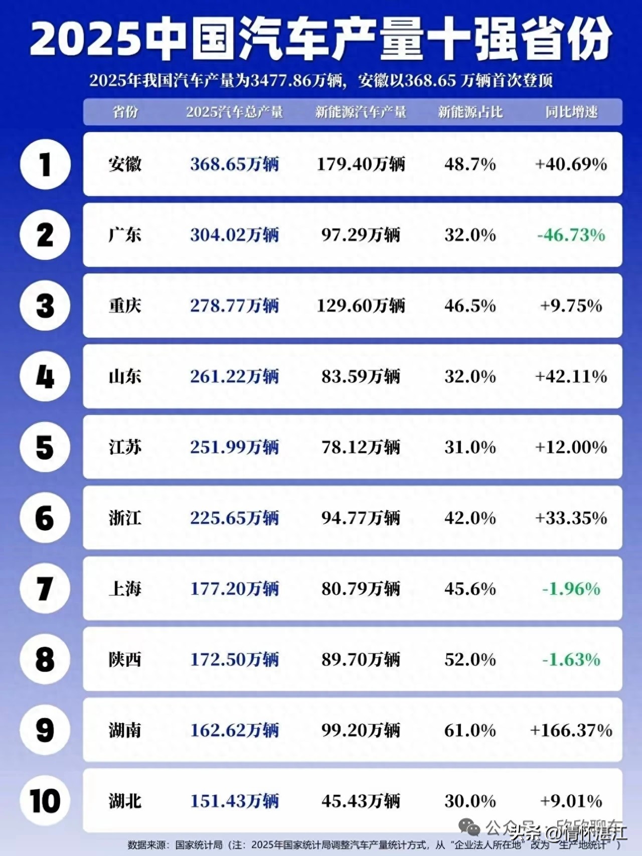 2025年中国汽车产业格局迎来巨变:全国总产量3477.86万辆,安徽以368.65万辆首次登顶,广东以304.02万辆退居第二,同比大幅下滑46.73%,新能源占比仅32.0%,远低于安徽、重庆等头部省份,传统燃油车产能萎缩、新能源转型滞后是核心症结。
