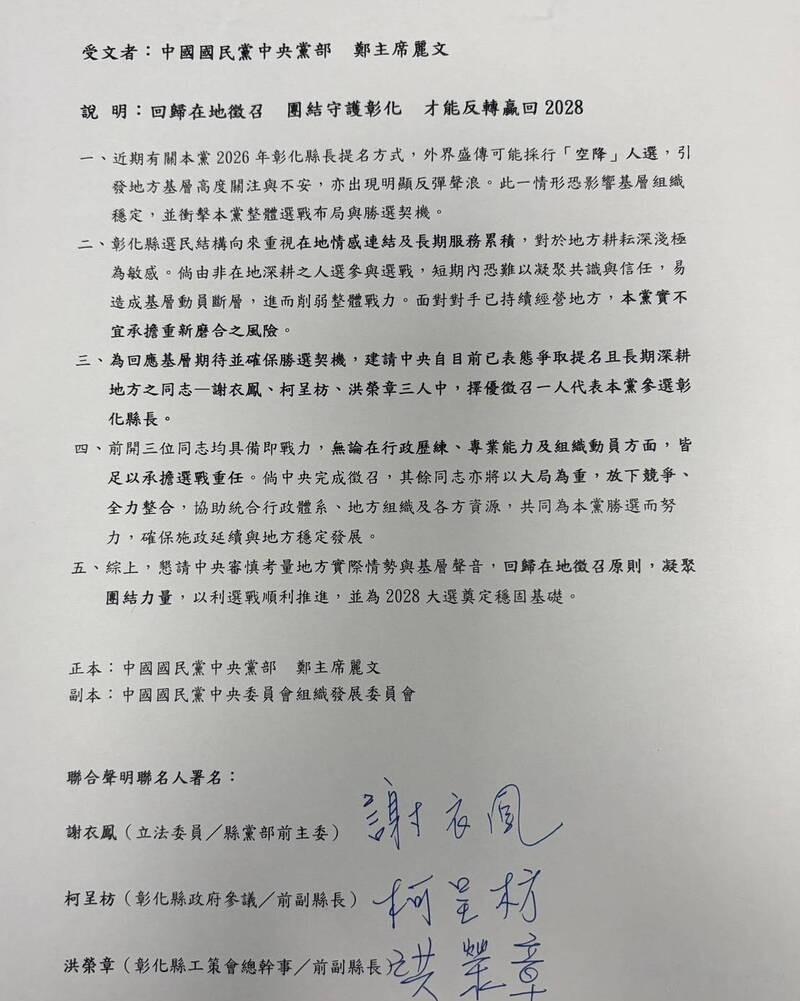 立委谢衣凤、县府参议柯呈枋、工策会总干事洪荣章于4月11日共同签署声明,要求国民党中央回归“在地征召原则”。声明中强调,只要国民党中央从这3人中择优征召1人,其余2人都会放下竞争,全力整合辅选。