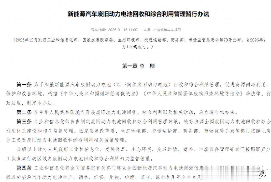 2026年4月1日起,工信部等六部门联合发布的《新能源汽车废旧动力电池回收和综合利用管理暂行办法》正式施行,其中“车电一体报废”制度成为最受关注的核心条款。