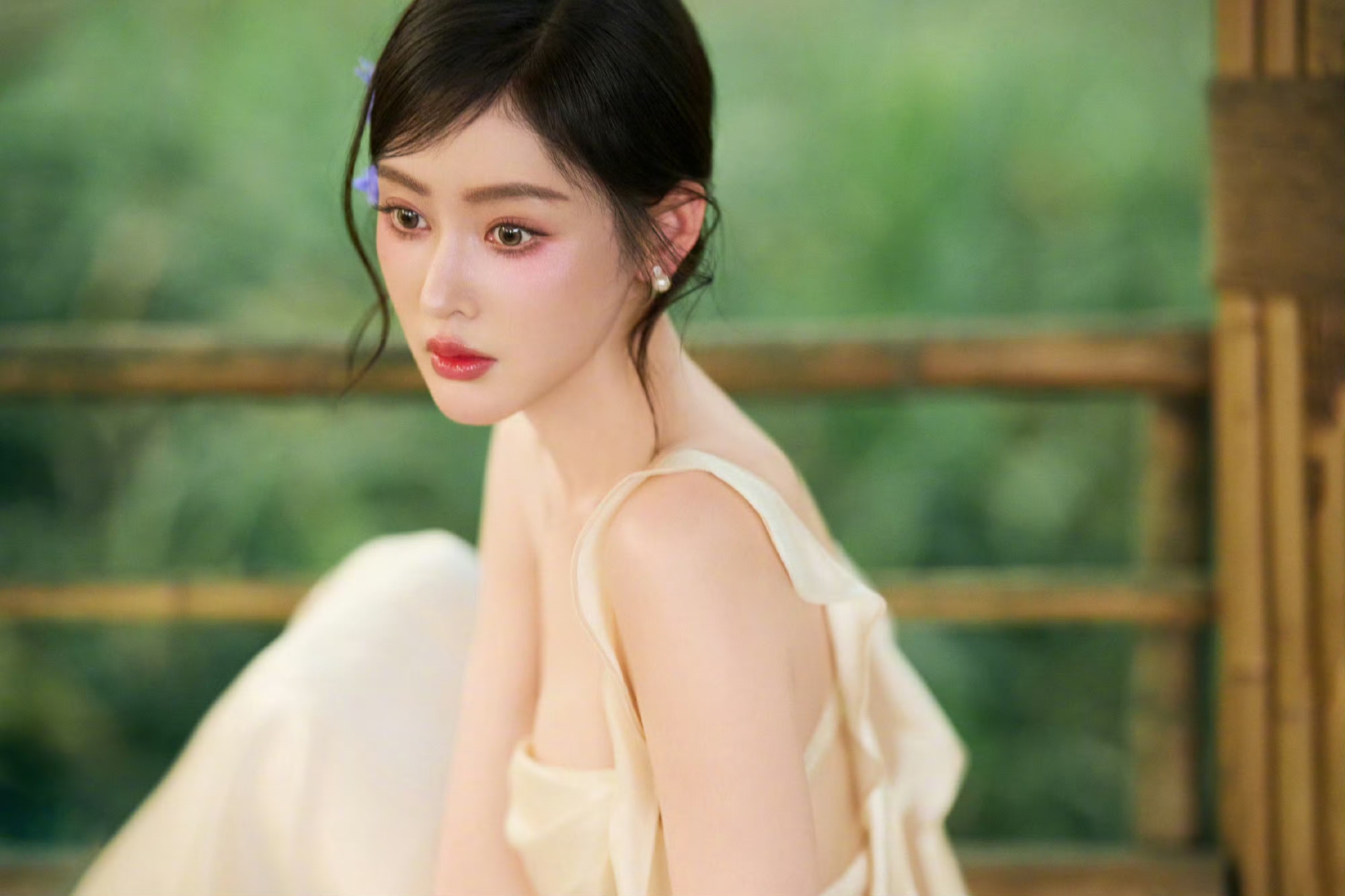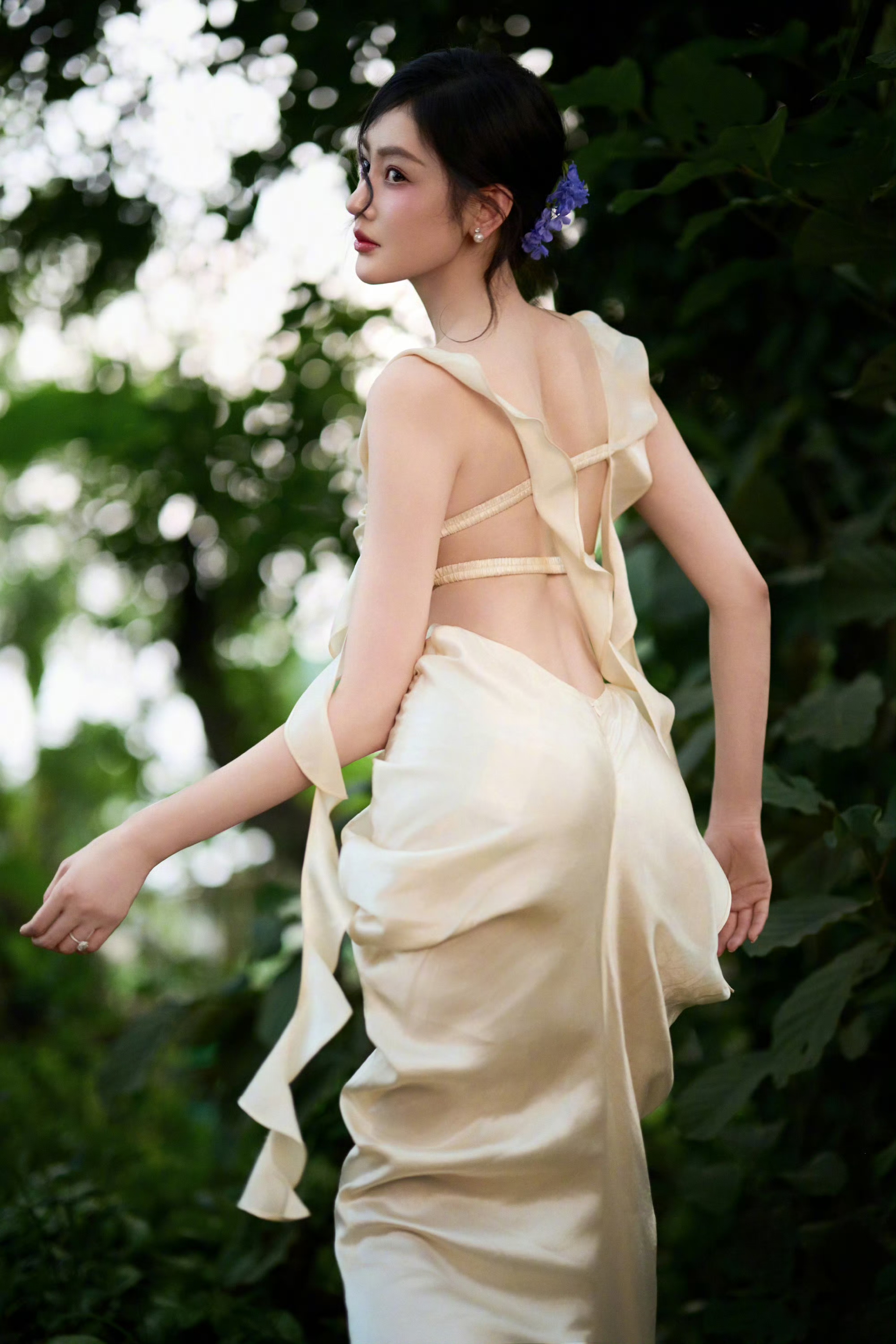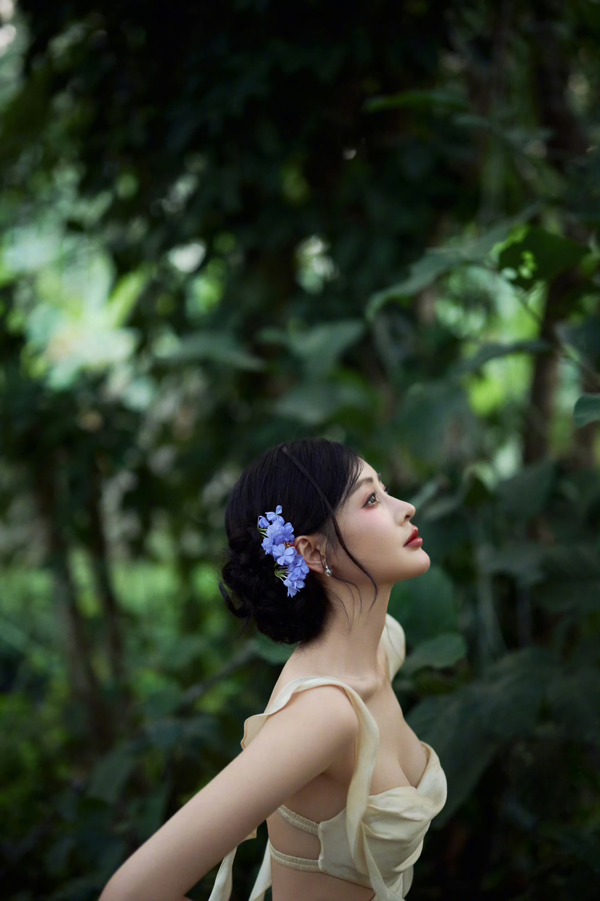 张天爱最新浅黄吊带抹胸连衣裙,丛林中的小仙女