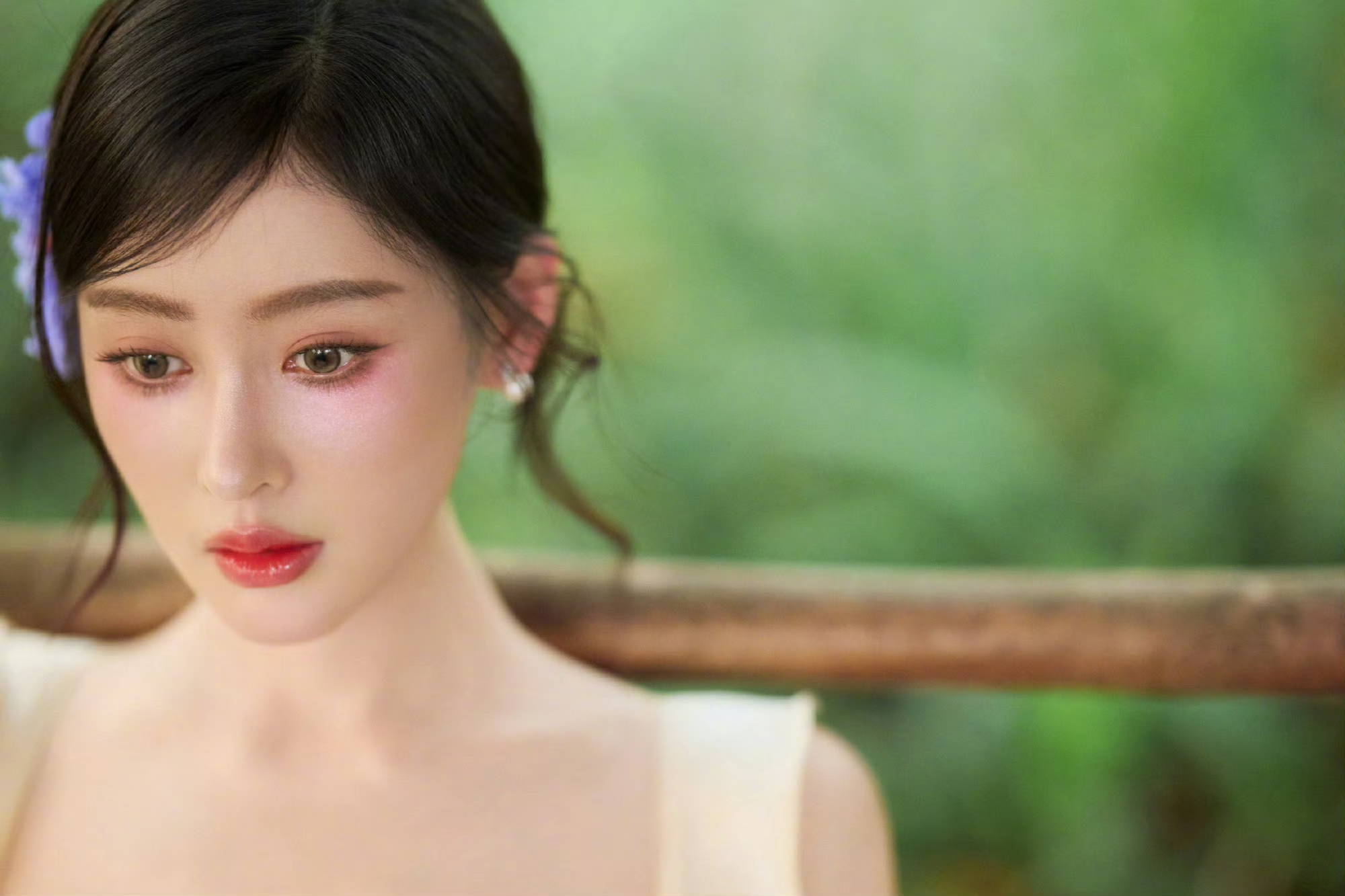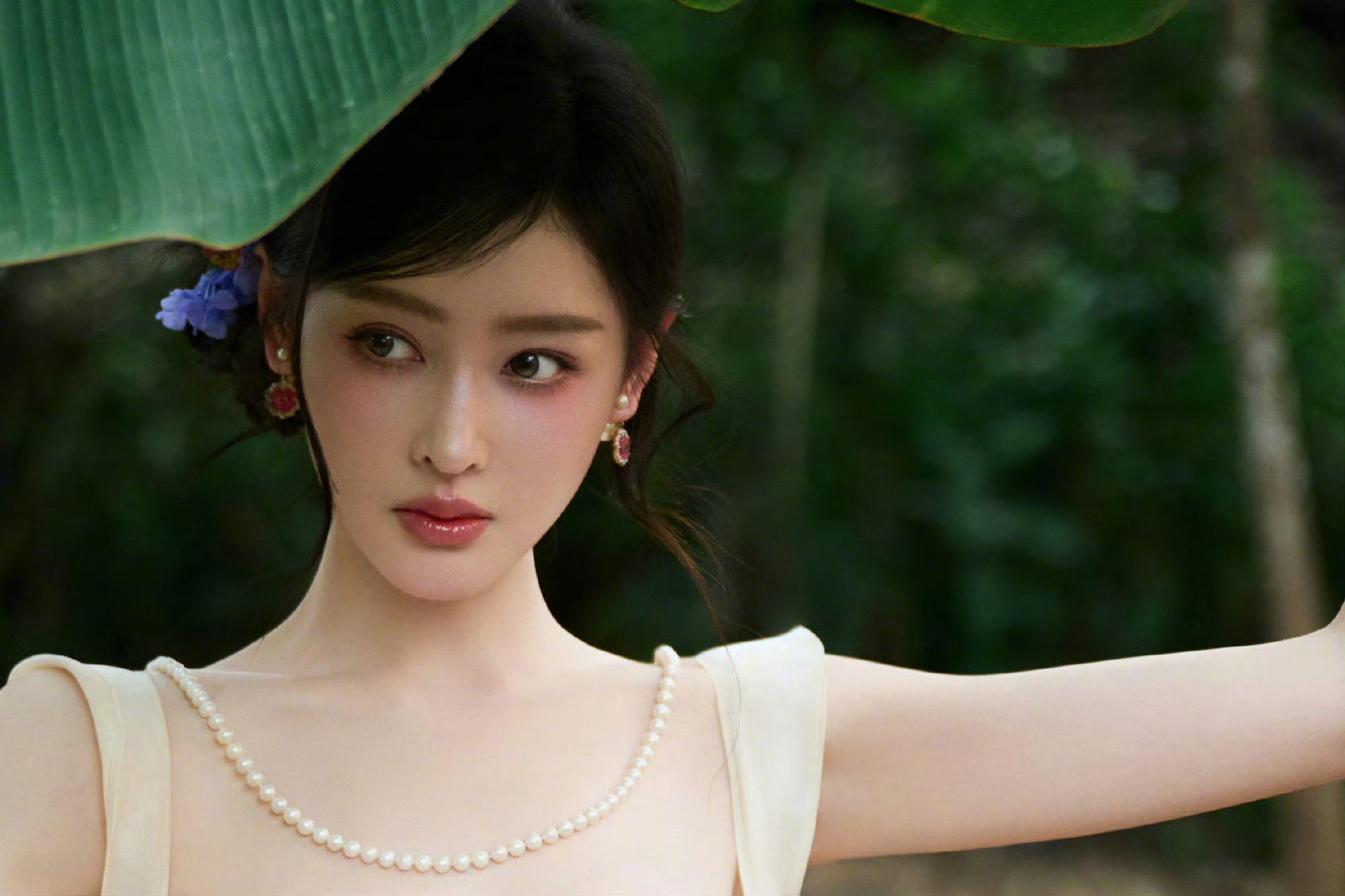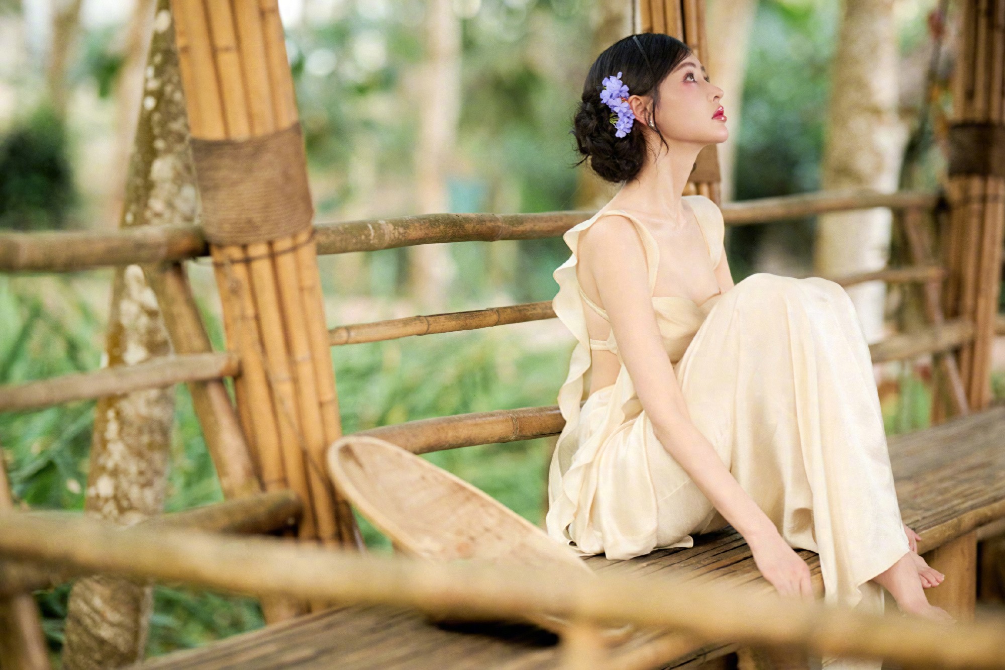 张天爱最新浅黄吊带抹胸连衣裙,丛林中的小仙女